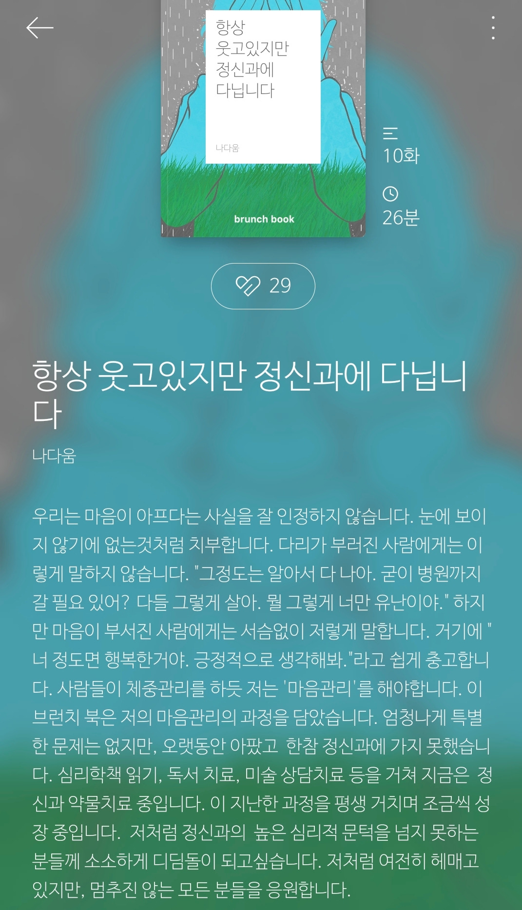 마음이 아프지만, 점심시간에나 겨우 정신과를 찾을 수 있었고, 그 사실을 주변에 감춰야만 했던 내가 있었다. 그런 현실이 더 쓰라린 상처가 되었고, 이것을 극복하는 나름의 방법으로 브런치에 글을 쓰게 되었다. '운' 좋게 '정신과 다닌 일'을 소재로 브런치 작가가 되었고, 탄생한 브런치 북이 "항상 웃고 있지만 정신과에 다닙니다"였다. 생각보다 많은 분들이 글을 읽어주시는 것이 나에겐 응원이 되었고, 정신과에 대한 편견을 스스로 떨칠 수 있었다.