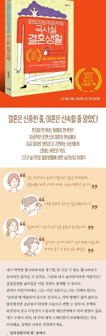 (출판사대표님이 보면 깜짝 놀라시겠지만, )네. 그렇습니다. 저는 아직도 심리상담을 받으며, 여전히 같은 곳에서 넘어지며 처음처럼 아파합니다. 숱한 마음공부와 경험에도 아픔을 느끼지만, 이미 지금 여기에는 온전한 나 자신이 있음을 잊지 않는 한, 내 마음이 조금 더 편안해지는 그 막연한 일에 계속 겁 없이 도전할 겁니다.