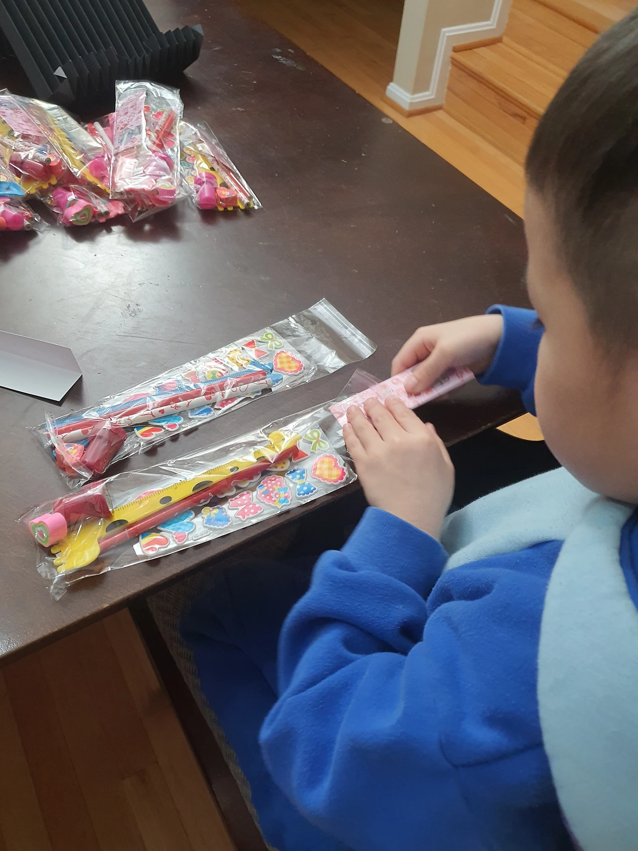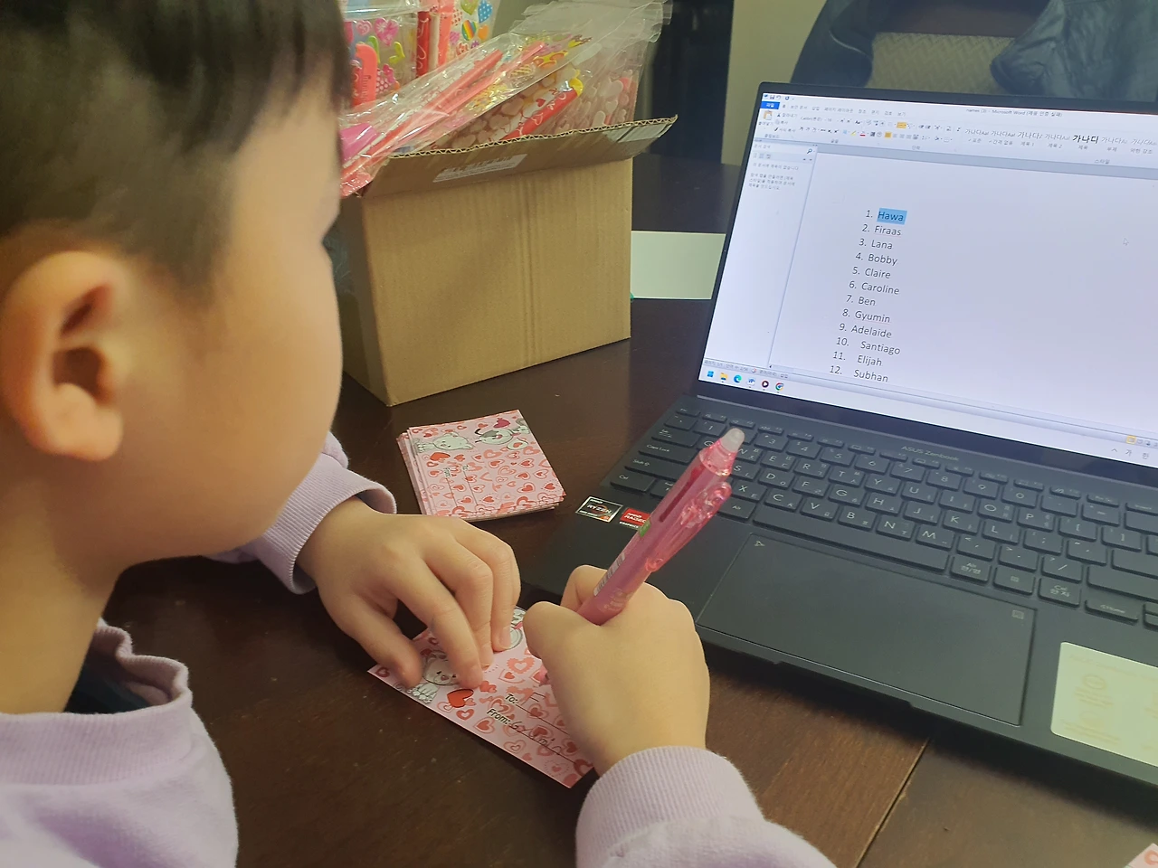 [아마존이 보내준 택배상자에서 모든 물건을 꺼낸 후 다시 재포장하고, 카드에 반 친구들 이름을 한명씩 쓰고, 포장해서 붙이면 끝. 온 가족이 첫째의 발렌타인데이를 준비에 동참]