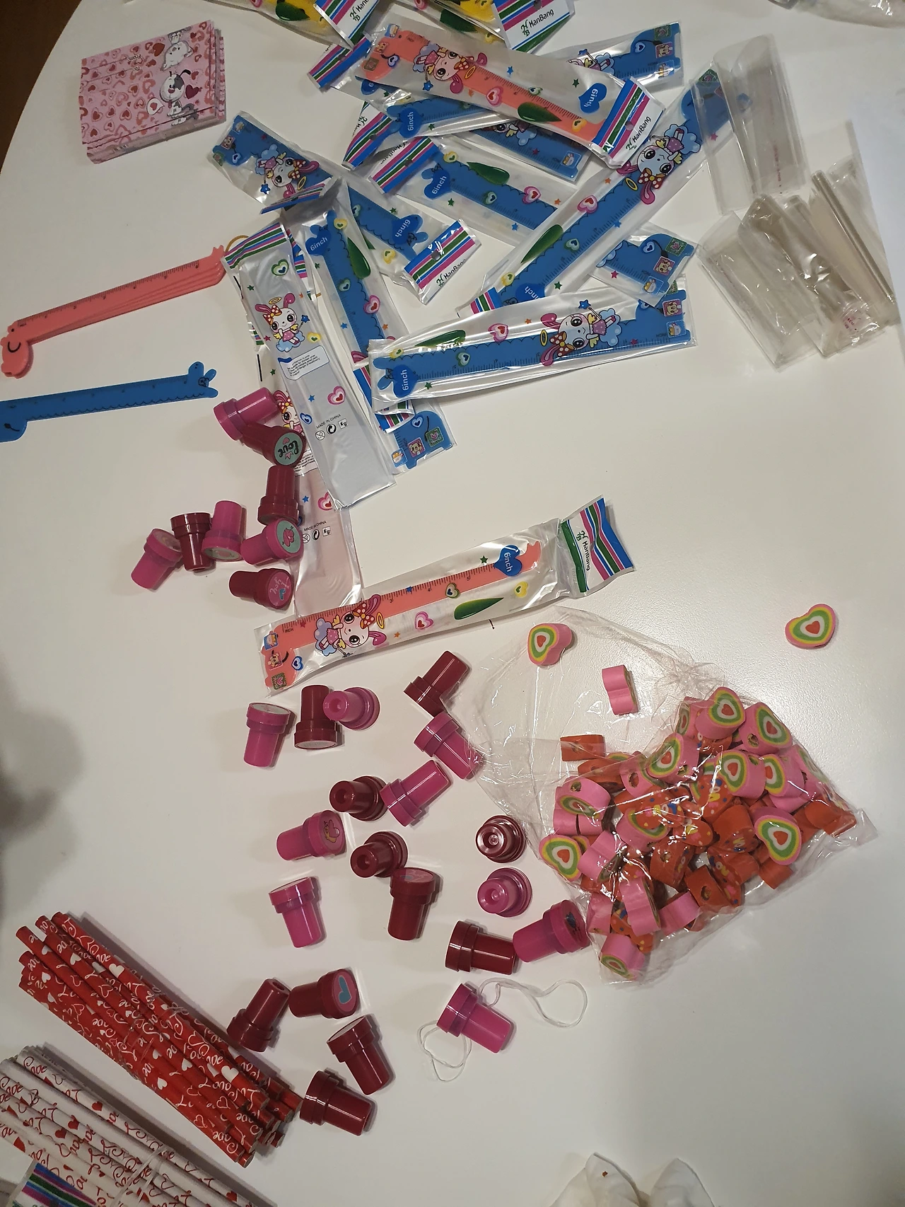 또 한 번 집단지성의 힘이 모여있는 맘카페('미국 버지니아 맘 카페'는 사랑입니다. 하하하)란 정보의 바다에서 힌트를 얻었는데, 아마존에 "valentines day school gifts for kids"로 검색하면 개당 $1 정도 하는 선물들을 한 번에 살 수 있다고 했다. 여러 가지가 있었지만, 상품후기 많은 무난한 학용품(지우개, 연필, 자 등으로 구성)으로 골랐다. 며칠 후 도착했는데, 개별포장되어 있는 게 배송 오는 줄 알았는데 아니었다. 구입자가 하나하나 묶음으로 온 학용품들을 손수 다시 포장해야하느 수고로움이 가미된 택배였다.(어쩐지 싸더라... 내 노동력을 넣어야 비로소 완성품을 볼 수 있다.) 그렇게 개별 포장이라는 가내수공업의 과정과 아직 알파벳 "b"와 "d"를 헷갈리는 아들이 반 친구들 이름을 카드에 쓰는 것을 하나하나씩 검수하는 단계를 끝으로 밸런타인데이 준비를 마쳤다. 하루 반나절은 꼬박 걸렸다.