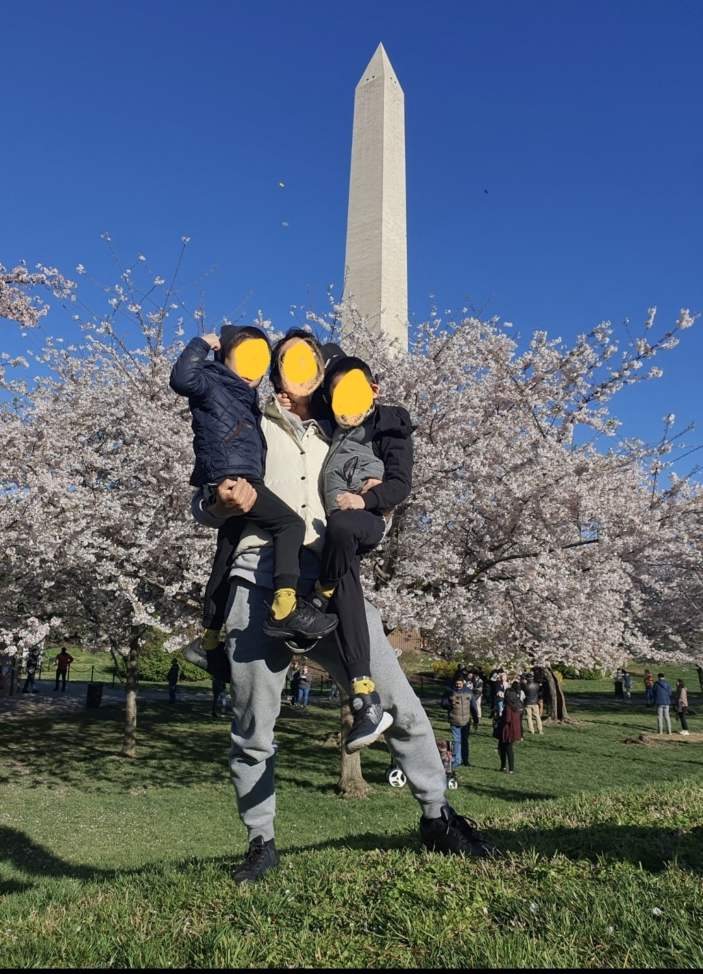 일단 벚꽃 스폿에 도착하면 최대한 많은 사진을 남겨야 한다. 물론 눈으로 보는 것도 매우 좋지만, 어차피 남는 것은 사진이기에 프사로 남길 수 있을 만한 퀄리티의 사진을 찍어야 한다. 여기서 주의점은 그냥 꽃만 배경으로 찍으면 여기가 여의도인지 워싱턴인지 차이점이 없다는 우리 집 남자들의 불만이 또 제기될 수 있기에, 뭔가 미국 스러운 조형물과 함께 찍어줘야 한다. 그래서 조형물도 나오면서, 많은 인파들이 최대한 덜 나오는 지점을 찾아서 우리 가족과 벚꽃만 나오는 구도를 찾아서 사진을 찍어댄다. 물론 빨리 가자고 재촉하는 나의 일행의 말은 듣는 척하며 가볍게 무시한다. 내년에 또다시 올지 미지수이기 때문에 눈에도 담고 카메라에도 연신 담아댄다. 그렇게 경보하듯 빠른 걸음으로 한 바퀴를 휙 돌고 어렵게 주차한 차로 다시 돌아온다.