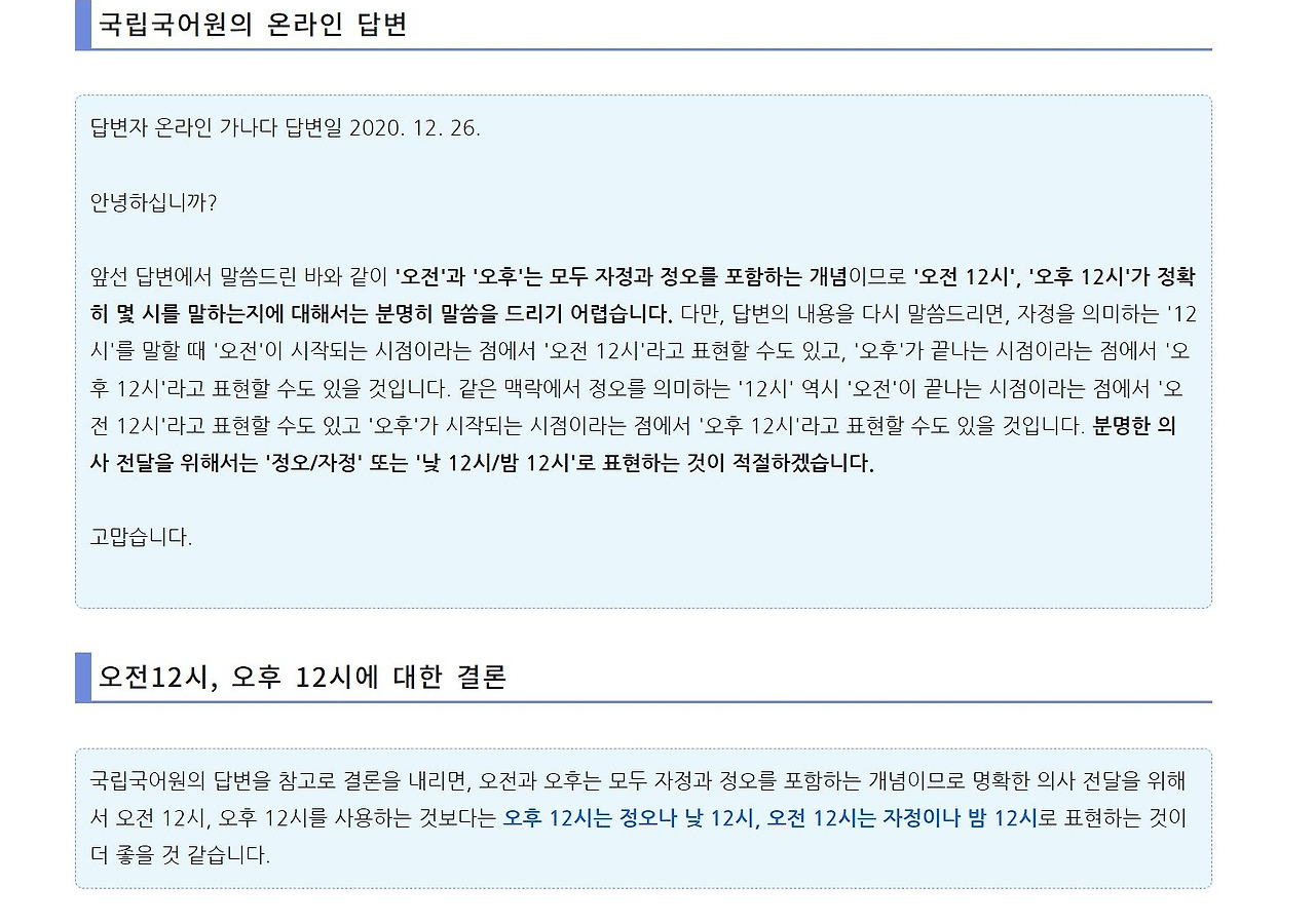 당연히 한국시간 기준으로 마감시간이 정해지는데, 지난번에는 시차계산을 잘못해서 하루 늦게 낸 적도 있고, 한 번은 하루빨리 제출해서 다시 한번 검토해 보라는 피드백도 받았다. 이러한 실수에 오늘은 아예 낮과 밤을 바꿔서 생각한 것이다. 거듭되는 실수에 이번 역시 나의 잘못으로 크게 받아들이며, 이런 단어 하나에서 헤매는 내가 무슨 작사를 하겠냐며 자책의 생각이 꼬리에 꼬리를 물어갈 때였다. 순간 이게 정말 내가 더 이상 작사를 하지 않아야 하는 근거가 될까 하는 생각이 들었다. 그리고 '오후 12시'란 용어가 정확한지 근본적으로 찾아봤다. (나 같은 이가 또 있었는지) 인터넷상의 국립국어원의 답변을 참고하자면, 다음과 같다 "'오전'과 '오후'는 모두 자정과 정오를 포함하는 개념이므로 '오전 12시', '오후 12시'가 정확히 몇 시를 말하는지에 대해서는 분명히 말씀을 드리기 어렵습니다.분명한 의사 전달을 위해서는 '정오/자정' 또는 '낮 12시/밤 12시'로 표현하는 것이 적절하겠습니다."라고 나와있었다.