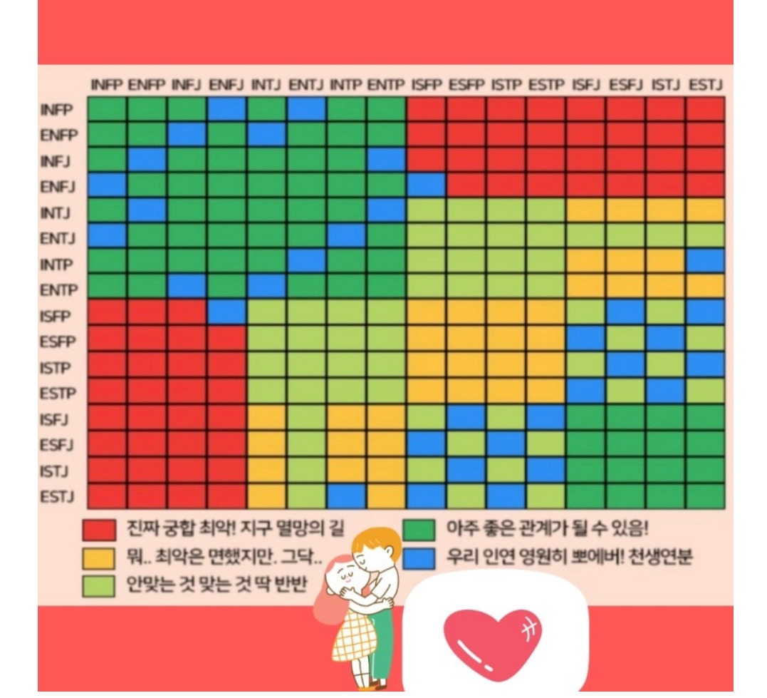 사실, 나는 결혼 전에 부모님의 권유로 지금의 남편과 사주로 궁합까지 확인하고 결혼했다.(참고로 우리 엄마와 나는 가톨릭 신자이다, 아멘.) 종교의 교리조차 잠시 잊을 만큼 한평생을 살 누군가와 나의 조합이 괜찮은지를 알고 싶었다. 사주상 나쁘지 않았고, 혈액형도 둘 다 (제멋대로) B형에다가, 같은 직업에 비슷한 연배이기에 많은 공통점을 바탕으로 서로를 인생의 동반자로 생각했던 것 같다. 실제로 결혼생활을 10년 넘게 하면서 여전히 많은 공통점이 있는데, 왜 갈등의 깊이가 깊고 주기가 잦을까를 생각하다가 최근에 그 이유를 어렴풋이 짐작하게 되었다, 바로 MBTI이었다.
