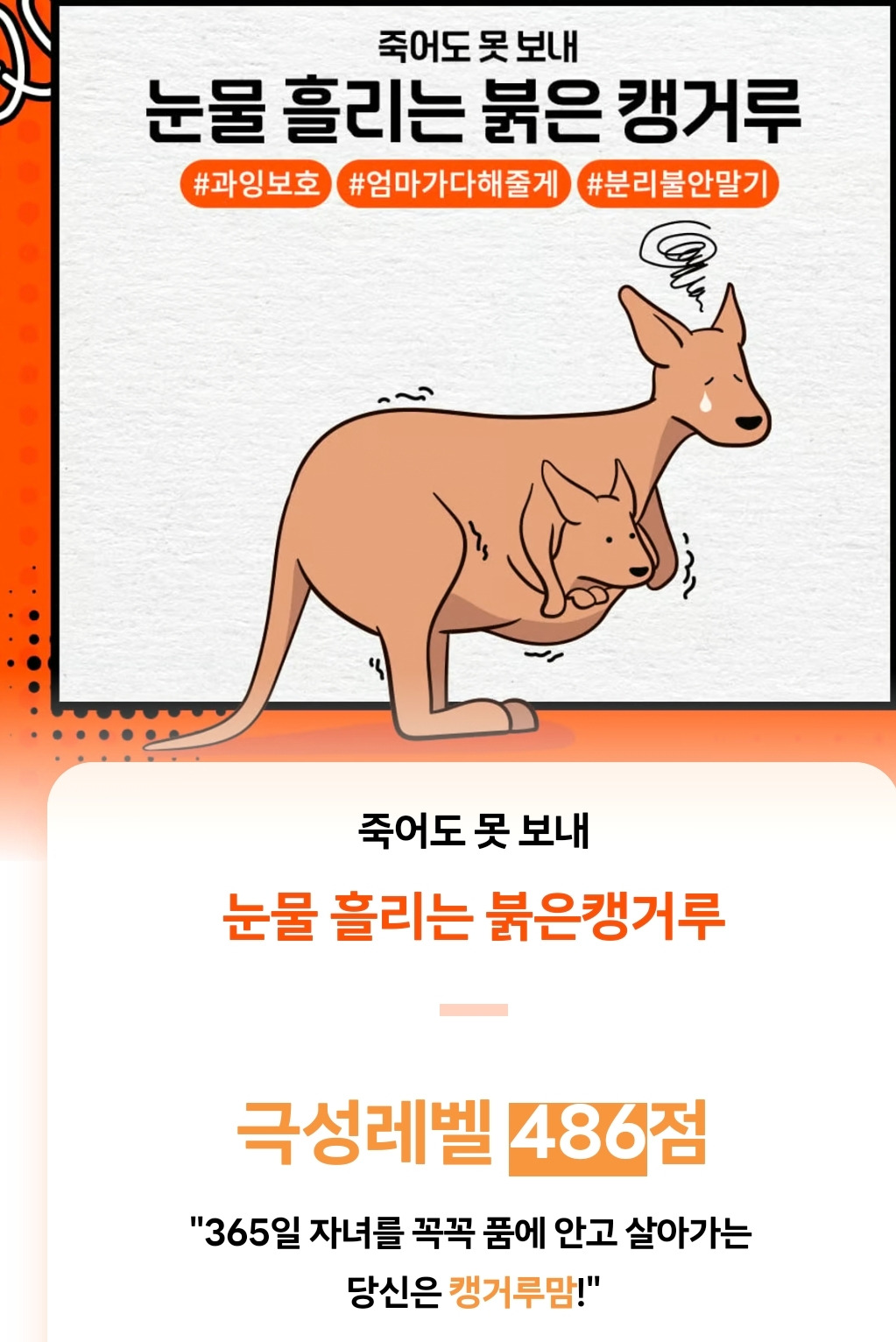 얼마 전 지인이 K-부모 테스트를 해보라며 URL을 보내준 적이 있다. 매우 독립적인 성향인 나는 마이너스가 나오면 어쩌나 하는 조마조마한 마음으로 해봤는데, 극성레벨 486점으로 이른바 "죽어도 못 보내 눈물 흘리는 붉은 캥거루 맘"이 나왔다.(#과잉보호, #엄마가 다해줄게, #불리불안말기) 참고로 나의 지인은 극성레벨이 999점이 나왔는데 그의 지극한 딸사랑을 보고 있자면 수긍이 갔지만, 나의 점수를 보고는 이 테스트의 정당성에 의심이 갔다. 그러던 차에 나의 극성레벨을 입증하는 사건이 생겼다.