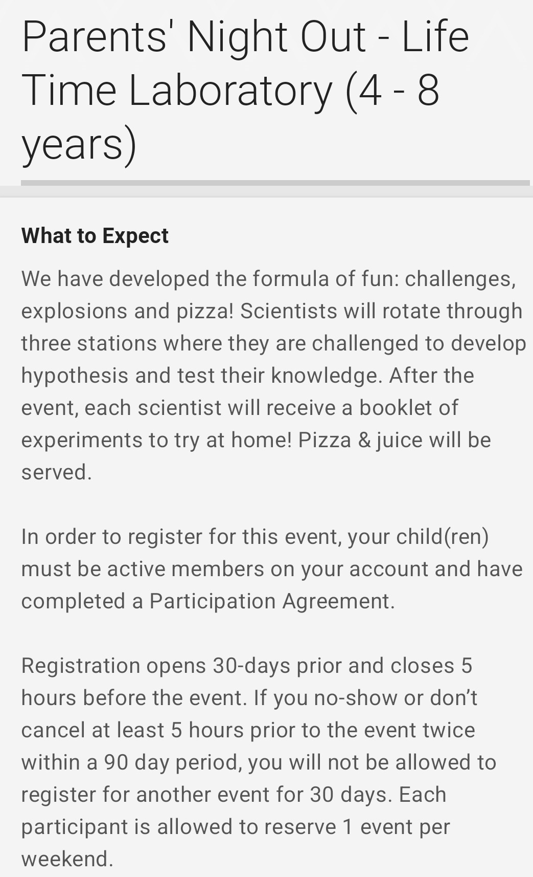 헬스장에서 토요일 오후 5시~8시까지 "Parent's Night out"이라는 아이들 대상 프로그램을 제공하여 3시간 동안 부모들에게 자유시간을 선사하는 바람직한 프로그램이 있다. 저녁으로 피자와 주스까지 무료로 제공해 주어, 주말 한 끼를 준비하지 않아도 되는 매우 고맙고도 훌륭한 프로그램이다.(사실 이 헬스장을 선택한 이유 중 하나이다. 하하하)