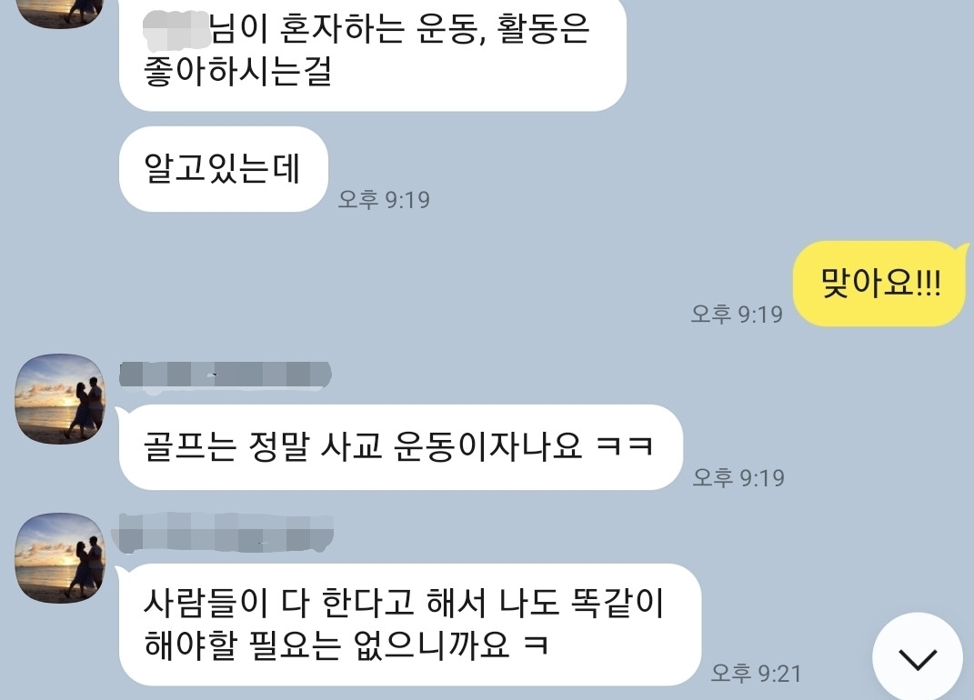 그러다가 지인과 이야기를 나누다가 문득 떠오른 생각, 내가 골프란 운동 자체를 안 좋아할 수도 있다는 사실이었다. 남에게 폐 끼치는 것을 극도로 싫어하고, 극 내향형으로 친한 사람에게만 입동굴을 개방하는 내가, 골프 초보자의 입장에서 경기지연이라는 어쩔 수 없는(?) 피해를 끼치는 상황을 알면서도 게임을 정상적으로 할 수 있겠는가. 즉 골프는 매우 사교적인 운동인데 나는 굉장히 비사교적 인간임을 간과한 것이다.