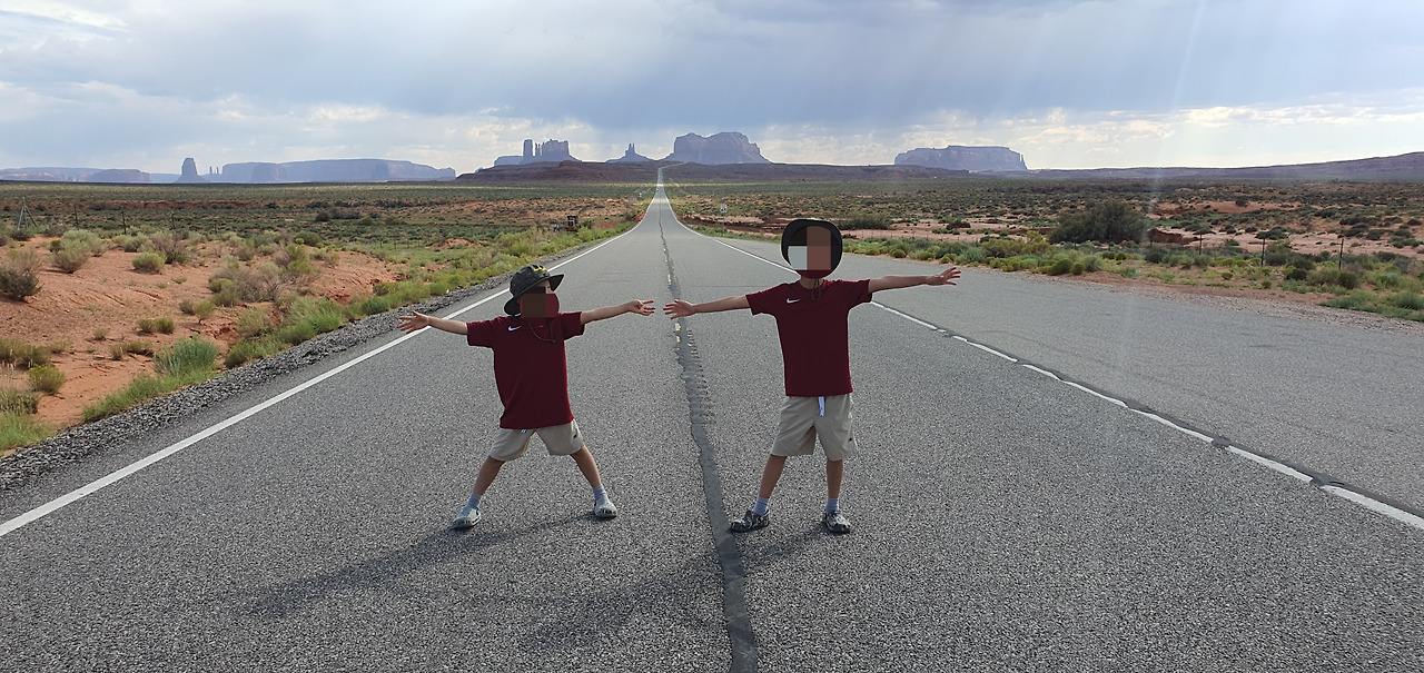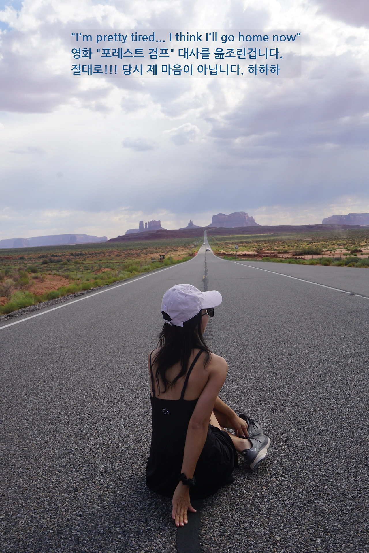 덧. 모뉴먼트 벨리로 가는 길에 사람들이 차가 달리는 도로에서 사진을 찍고 있는 것을 보았다. 찾아보니 영화 '포레스트 검프' 촬영 장소였고, 주인공이 돌연 달리기를 중단하고 집으로 돌아간 곳이라고 한다. 많은 사람들 중에서 차례를 기다리고, 차가 오는지 눈치를 살피고, 애들 사진을 찍어주고 나도 인증샷을 남겼다. 사진 찍자고 하면 엄청 투덜대다가 막상 사진을 찍으면 서로 먼저 찍겠다고 다투는 아이들을 어르고 달래 가며 빠르게 버튼을 눌러댔다.
