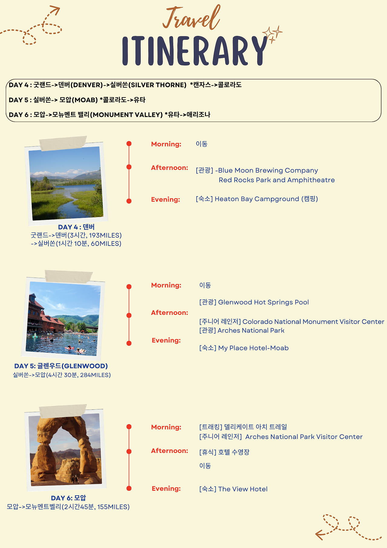 이제껏 보지 못한 것을 접했을 때, 기분은 묘하다. 콜로라도에서 거대한 붉은 바위들에 둘러 쌓여 드럼소리를 들었을 때, 유타에서 자연이 만든 거대한 아치들을 봤을 때 내가 알던 세계에는 없던 것들이었다. 고작 할 수 있는 반응이란 게 탄성을 자아내는것 뿐이었다. 내가 알던 세상이 전부가 아니라는 것을 깨달으며 겸손함을 찾는다. 어제까지만 해도 바위는 회색이었는데 붉은색 바위가 대부분인 곳을 방문하고 바위색의 스펙트럼이 넓어졌다. 오전 9시 하면 보통 여름에도 선선한 날씨를 떠올렸는데 이젠 숨이 막힐듯한 더위가 시작되는 시간이 될 수 있다는 것을 안다. 여행이란 건 이렇게 기존에 가지고 있던 고정관념을 하나씩 오감을 통해 부서뜨리는 과정이었다. 딱딱하게 굳어버린 내 심장과 머리에 노크를 하고 다가와서 '어서 와, 이건 처음이지? 자, 봐봐. 이런 것도 있어'하고 나를 유연하게 만들어준다.
