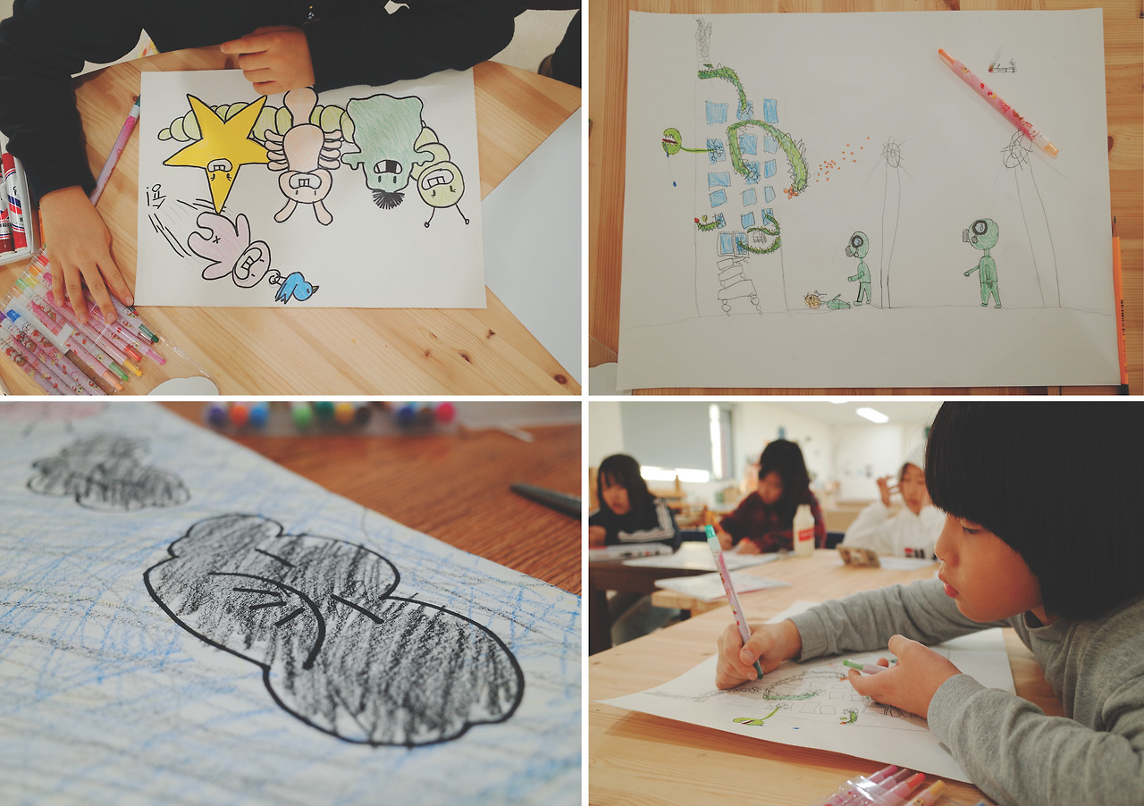 그렇게 의견을 모은 75년 후 도시의 환경 속에서 우리의 집은 어떤지, 학교와 병원은, 거리와 바다는 어떨지 각각 주제를 잡고 그림을 그렸습니다.