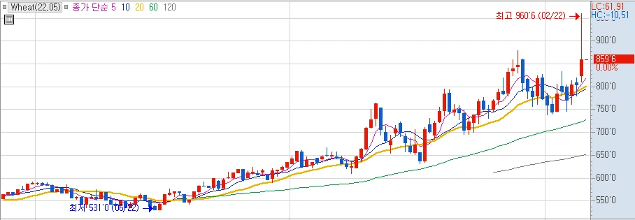 우크라이나는 밀과 옥수수의 세계적인 곡창지대 중 하나, 전쟁으로 인해 공급에 대한 우려로 미친 듯이 치고 올라가기 시작했다.