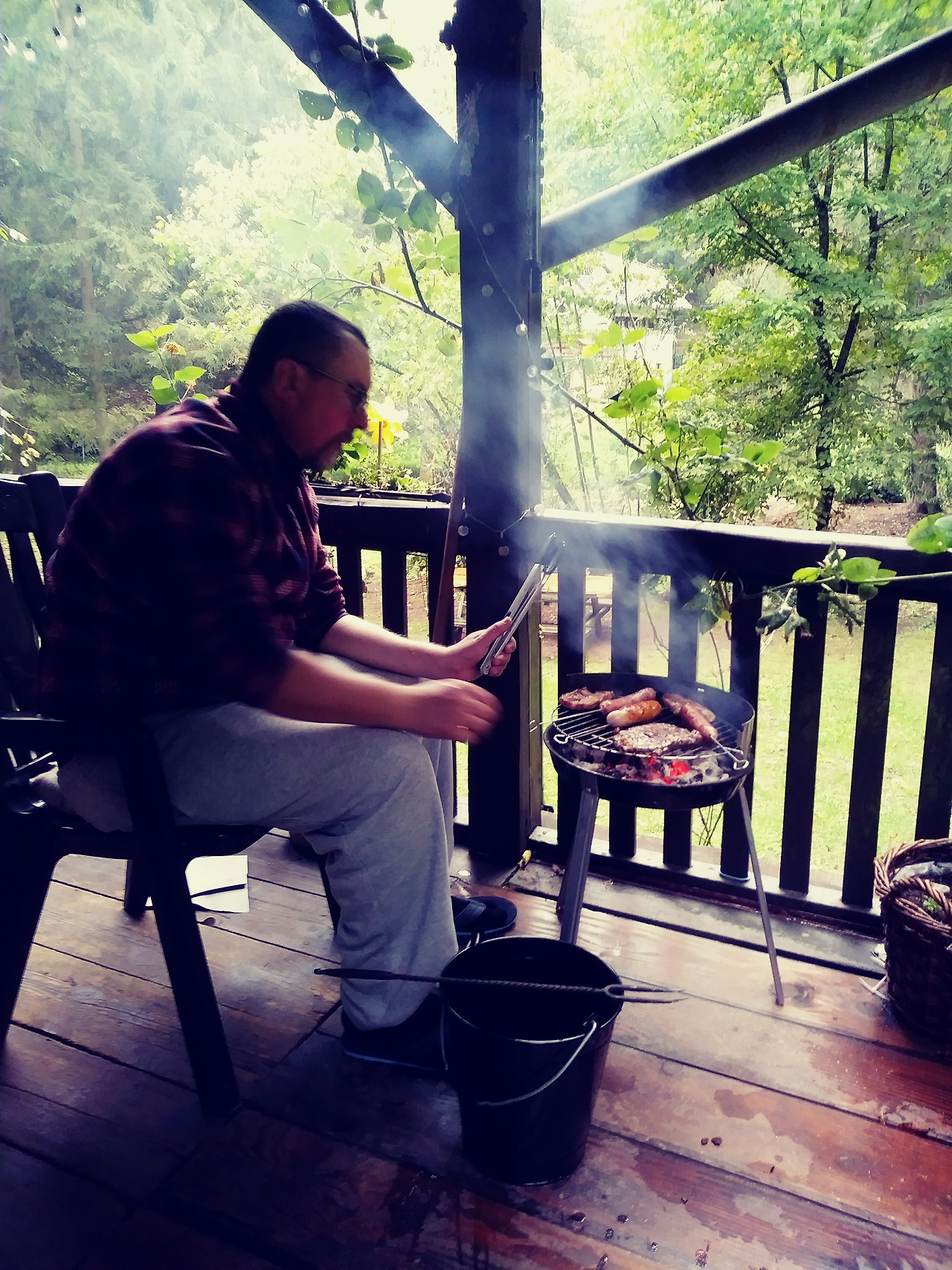그릴에선 쏘세지와 고기들이 익어가는중.