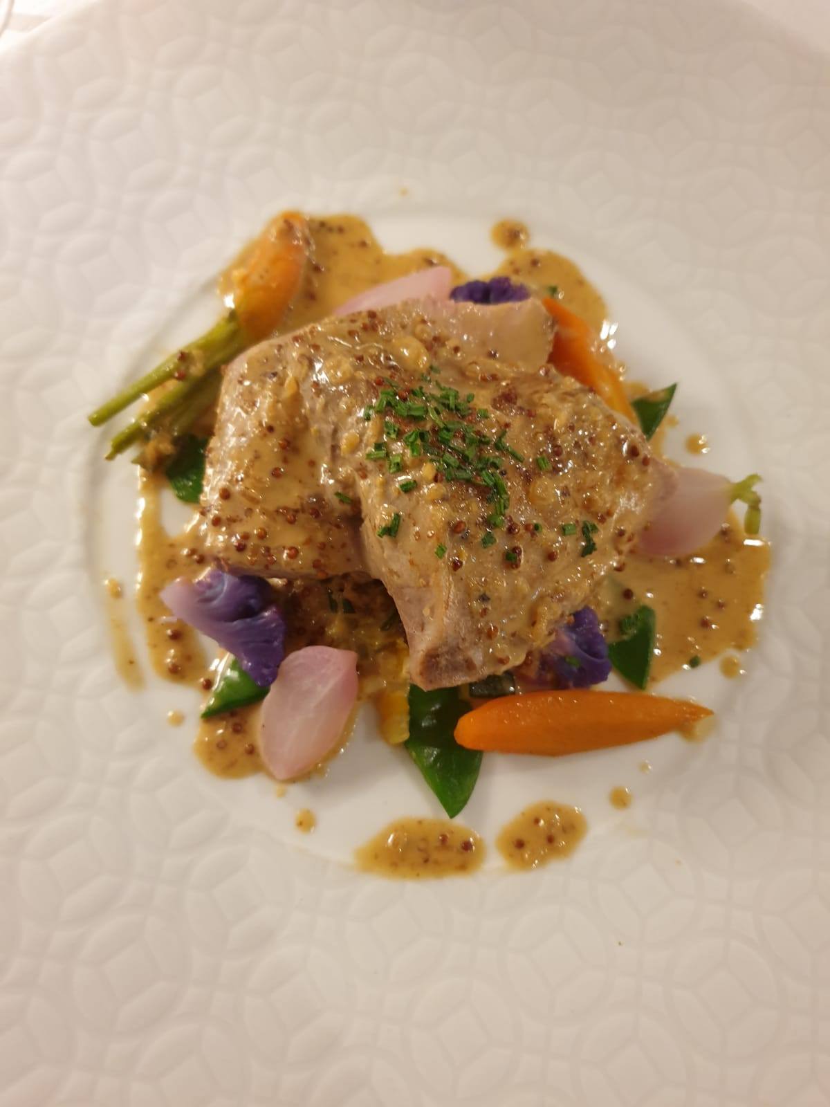 시골식당이라 그런지 코스요리가 아주 저렴했다. 전채요리, 메인요리, 후식 포함하여 33유로. 물론 60유로 이상되는 메뉴도 있고 1000유로 씩이나 하는 와인도 있었지만, 33유로짜리 코스요리와 하우스 와인이 비교적 많이 팔리는 것 같았다. 내가 먹었던 요리는 아래와 같이. 음식에 그림을 그려놔 먹기가 황송스러울 지경의 요리.