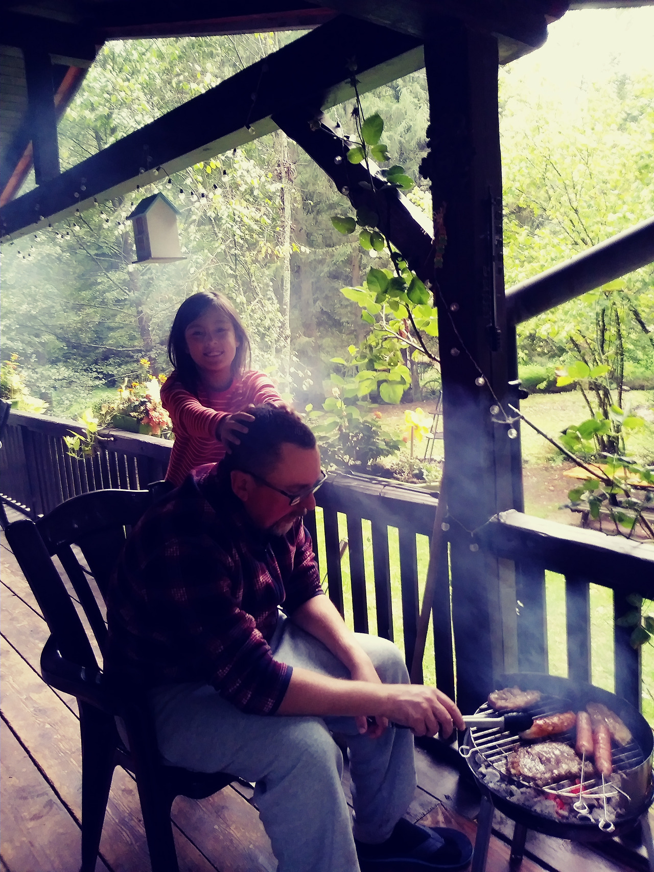 미나가 아빠의 머리를 맛사지해주는 중. 방만구는 두통으로 고생하는 중. 두통으로 고생하는 와중에도 고기를 먹겠다고 그릴연기를 마시는 중.