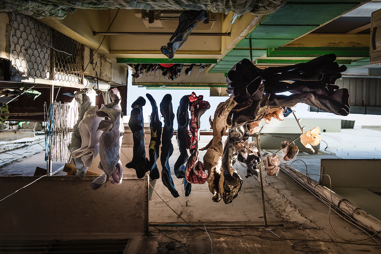 빨래를 널어서 말리는 모습을 아래쪽에서...