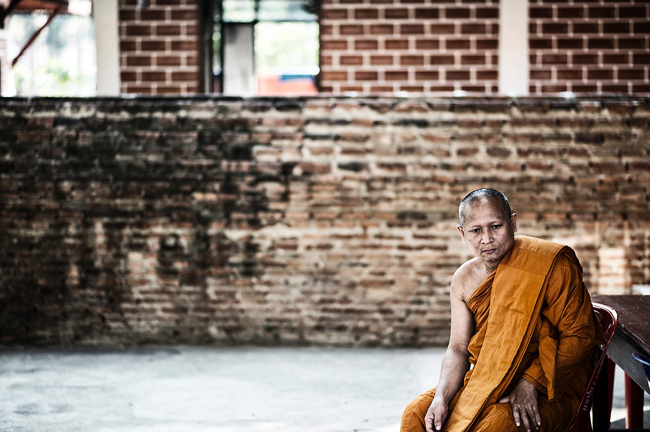 오렌지 승복을 입고 상념에 빠진 아유타야의 한 승려의 모습...