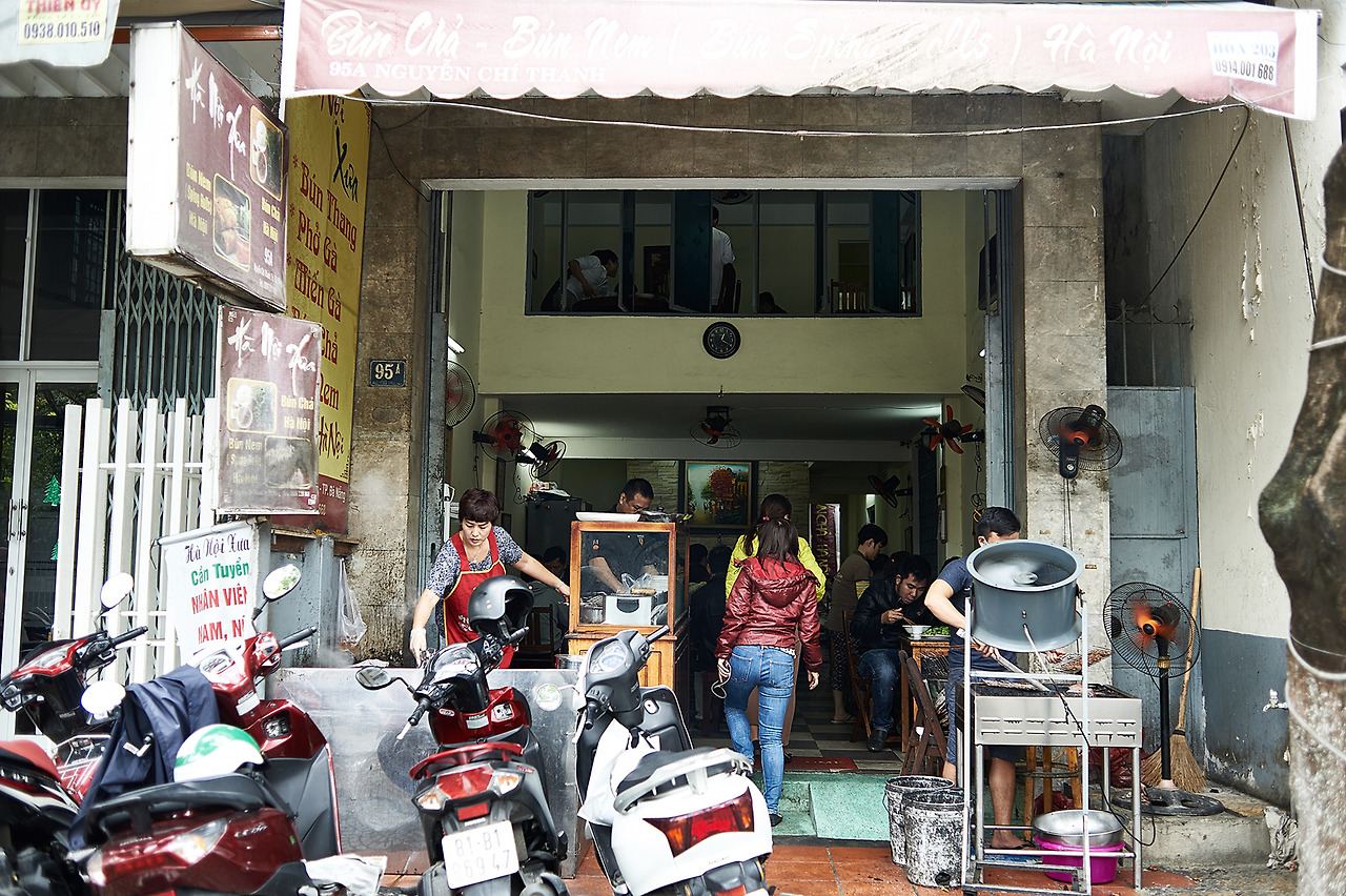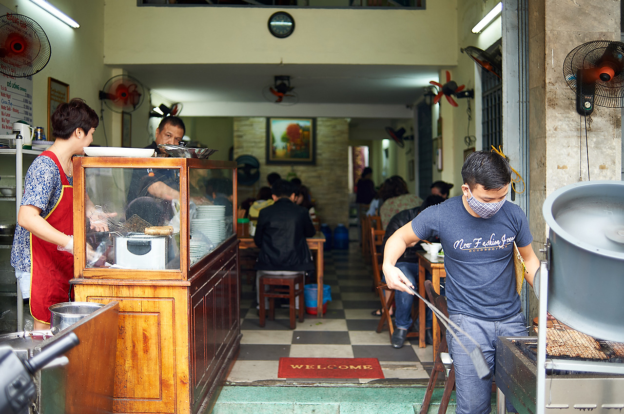 입구에는 분짜에 들어가는 돼지고기를 숯불에 열심히 굽는 사람과 카운터가 있고