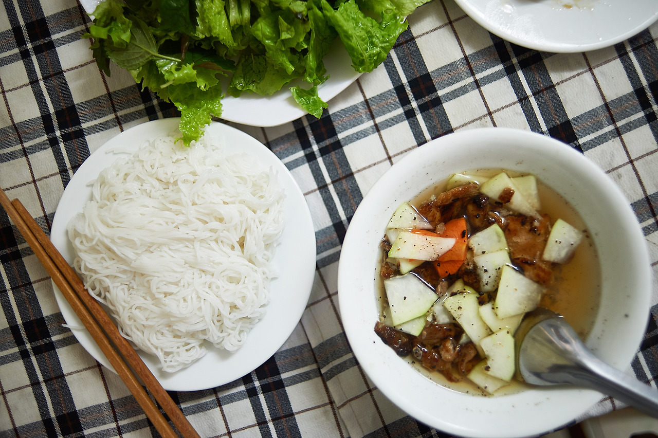 북쪽지방에서 사용하는 가느다란 쌀국수를 국물에 적셔서 채소와 고기와 함께 얌얌~