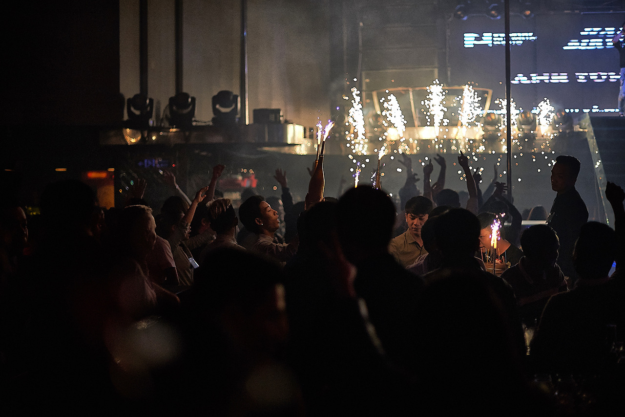 누군가의 생일파티? 샴페인에 불을 붙여 분위기를 돋구네요