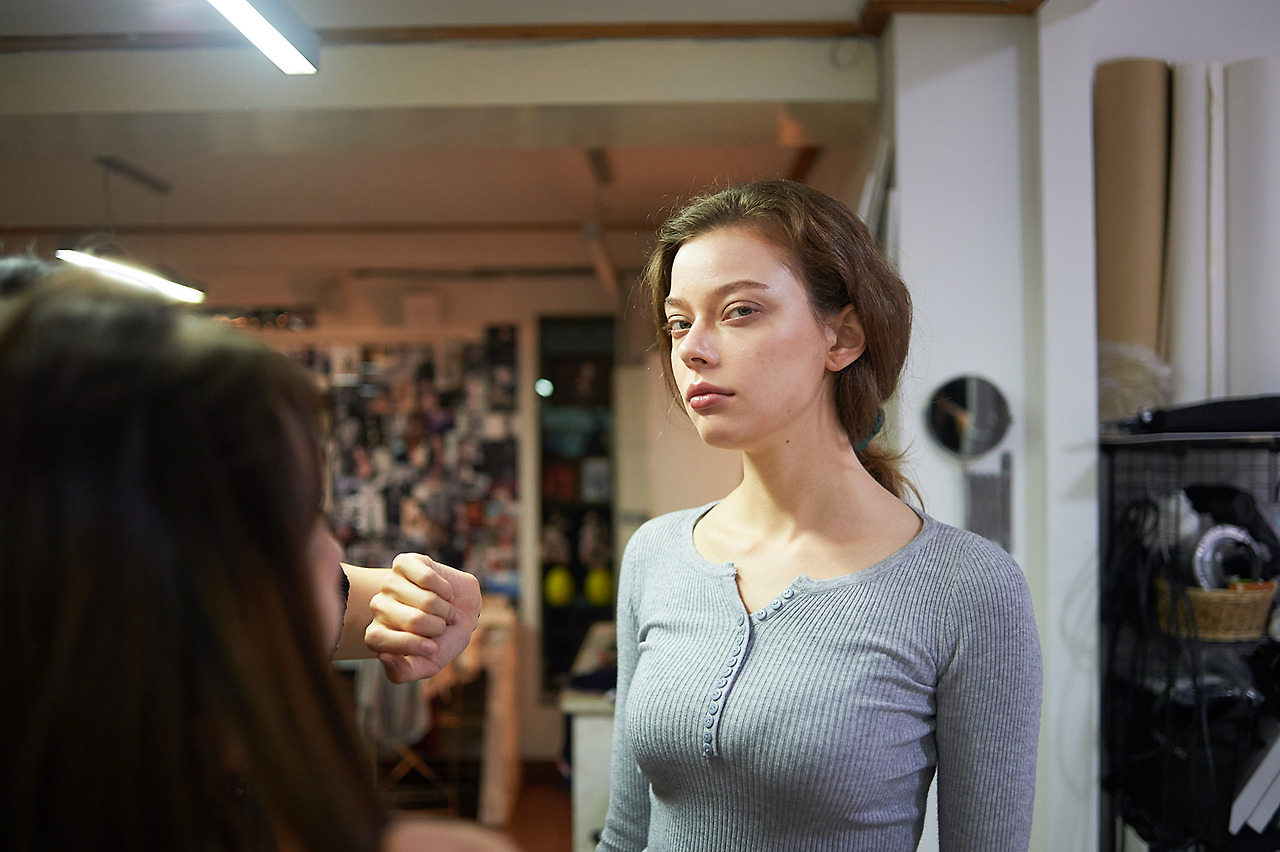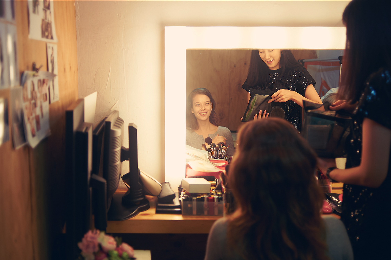 도착한 모델 둘이 메이크업을 받기 시작합니다.