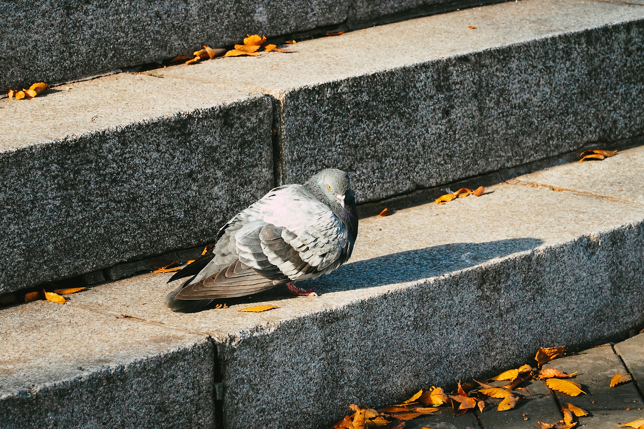 쌀쌀한 날씨지만 햇살이 따스했기에 햇볕을 쪼이고 있는 비둘기..
