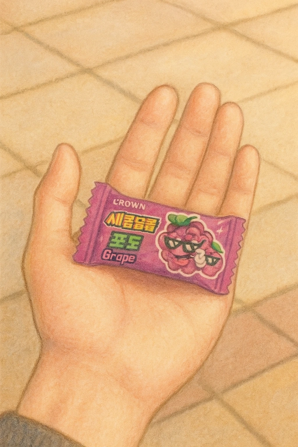 그 손에는요, 참 귀엽게도 아까 K와 E가 둘이서 나눠 먹다 남은 새콤달콤 하나가 들려 있었더랍니다.