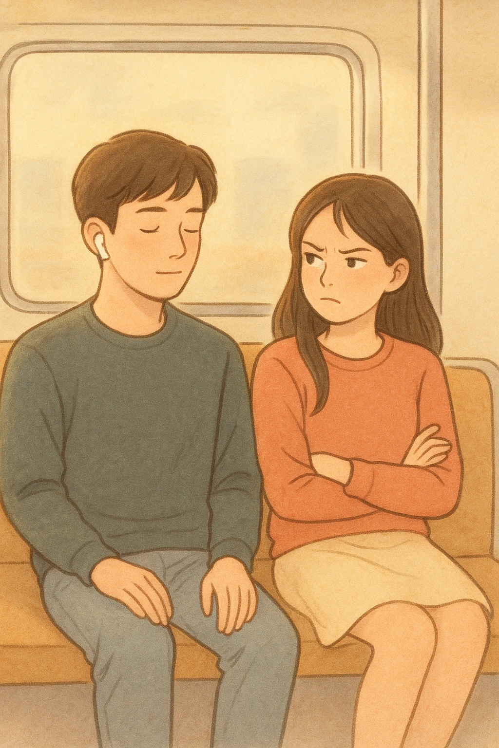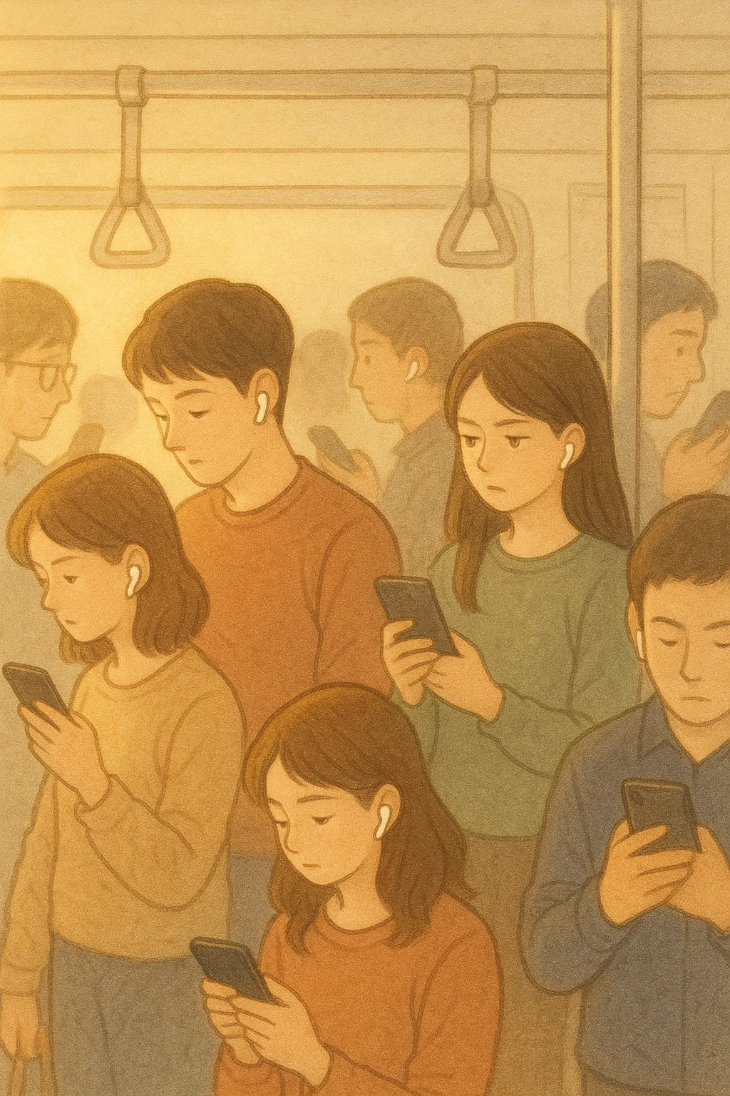 그런 E의 말을 들은 K는, E에게 온전히 주었던 시선을 지하철 안의 다른 사람들에게 돌려보기 시작합니다. 누군가에게는 퇴근길, 누군가에게는 출근길이 되는 저녁 7시의 지하철 안, 각자가 자기만의 세상에 빠져 있으면서도- 그 누구도 이어폰을 끼지 않은 사람은 찾기 힘들었습니다. 분명 같은 공간 안에 있지만, 각자의 어깨 만한 사이즈의 벽을 두고 서 있는 듯한 느낌이랄까요.