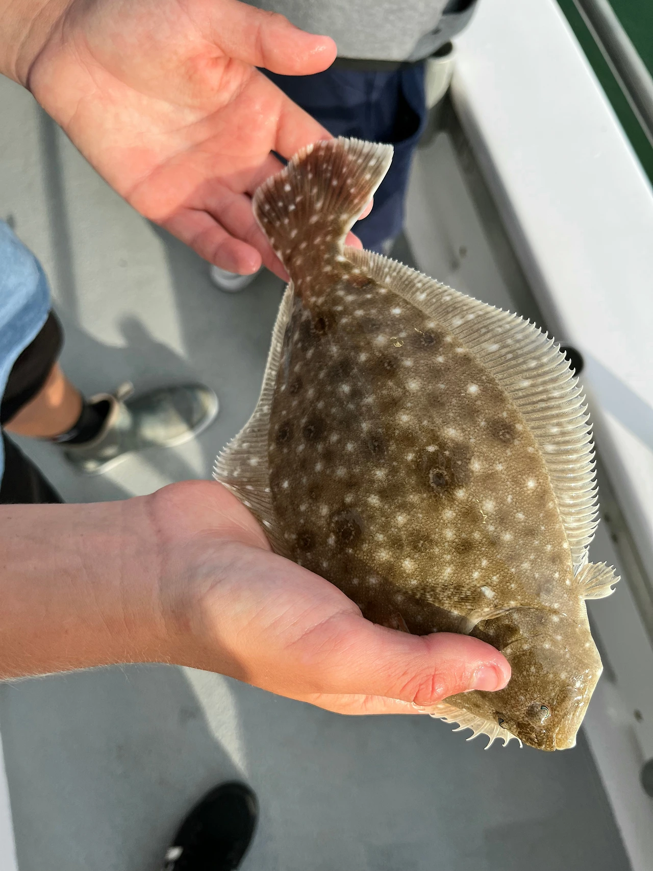 광어를 집에 가져가기 위해선 18.5인치(47cm) 이상의 큰 녀석을 잡아야 합니다. 그보다 작은 친구들은 "엄마를 데리고 오렴"이라고 주문을 외우면서 다시 풀어줍니다.