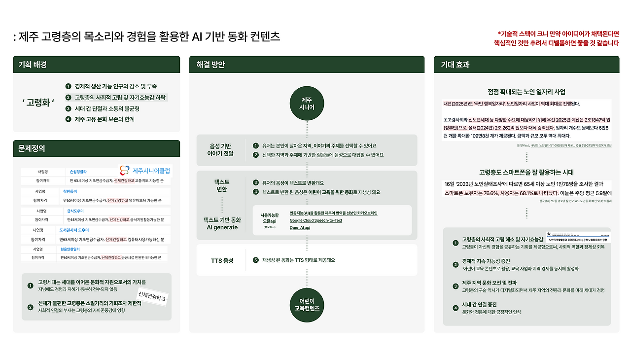 그래서 결과적으로 제주고령층의 이야기를 AI를 사용해 동화로 변환, 아이들의 교육 콘텐츠로 만드는 서비스 구상했고 발표자료를 만들었다. 발표자료에 넣지는 않았지만, 그 이후에는 지도에 핀을 꽂아 아이콘으로 표시하는 것이었다. 개발 스펙이 지금도 큰데 더커질 것 같아 그 이후는 아이디어가 채택되면 디벨롭하는 방향으로 가져갔다.