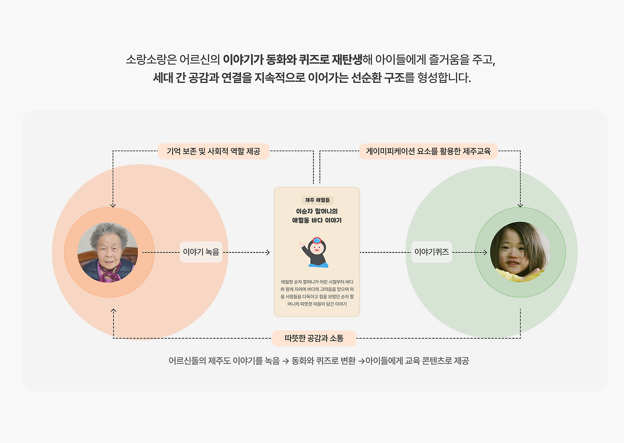 고령층이 가진 가장 독보적인 가치는 삶의 지혜와 쌓아온 삶의 경험일 것이다. 더불어 제주는 고유한 문화와 역사가 살아있는 지역이기 때문에, 이 두개가 합쳐 좋은 시너지를 낼 것이라 생각했고, 이를 사회적으로 환원할 수 있으려면 아이들의 교육 콘텐츠가 가장 적합하다고 생각했다.