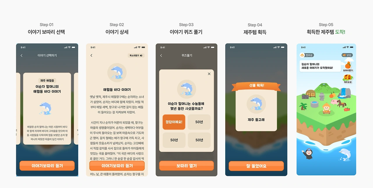 어르신들의 음성을 매개체로 제주 지역의 이야기를 알리고, 어린이들은 동화로 변환 된 어르신들의 이야기를 듣고 퀴즈를 맞추는 플로우로 구성되었다. 어린이들 (학부모)를 대상으로, 퀴즈를 풀고 제주템을 얻어 나만의 섬을 꾸미는 게이미피케이션 요소를 활용한 UI를 디자인했다.