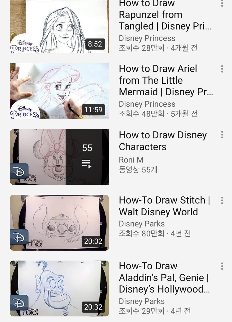 (참고로 영상은 디즈니 블로그에서 'Learn to draw'를 검색하면 만날 수 있다.)