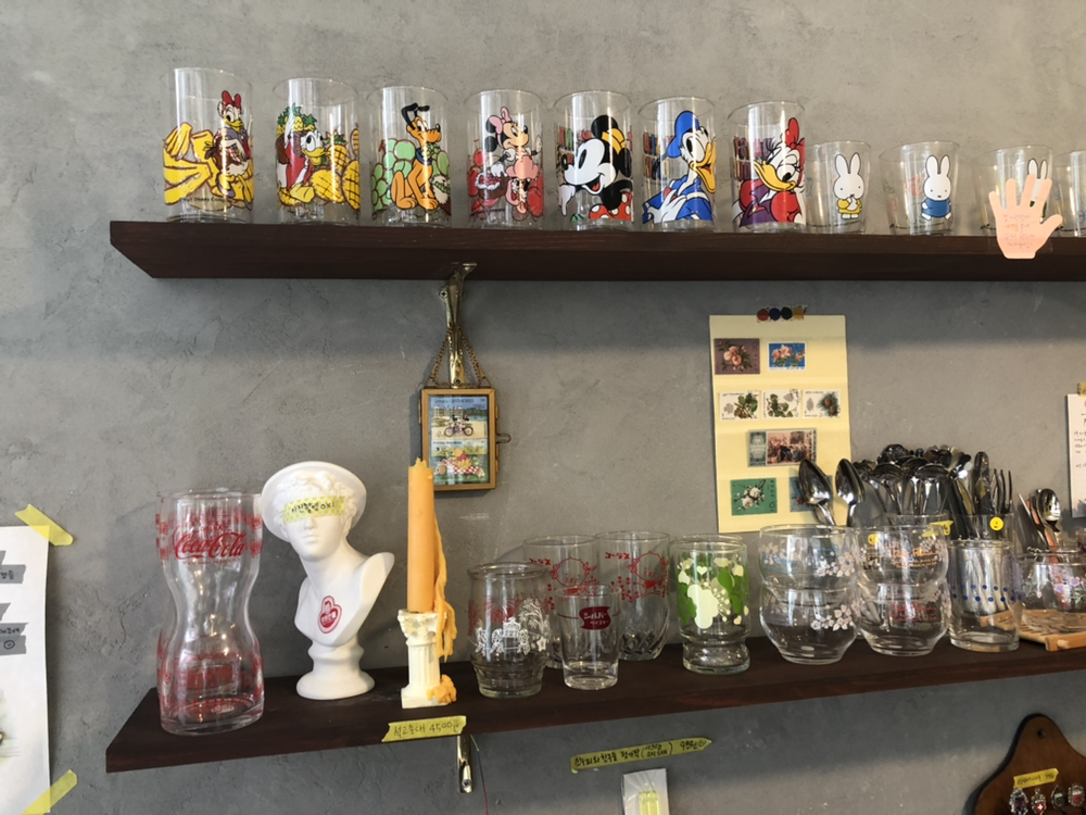 공간이 넓지 않아 성인 4~5명만 들어가도 내부가 꽉 차지만, 좁은 공간에 오밀조밀 놓인 물건들을 구경하는 재미가 있는 곳. 이 가게의 자랑거리는 단연 빈티지 컵들. 미키마우스, 미니마우스 등 디즈니 캐릭터들과 스누피의 모습을 감은 컵들이 선반에 쭉 진열됐다. 다꾸에 유용한 스티커와 떡메모지도 한가득이다. 빈티지 상품들을 2000원~1만원에 선보이는 '혜자존'도 눈에 띈다.