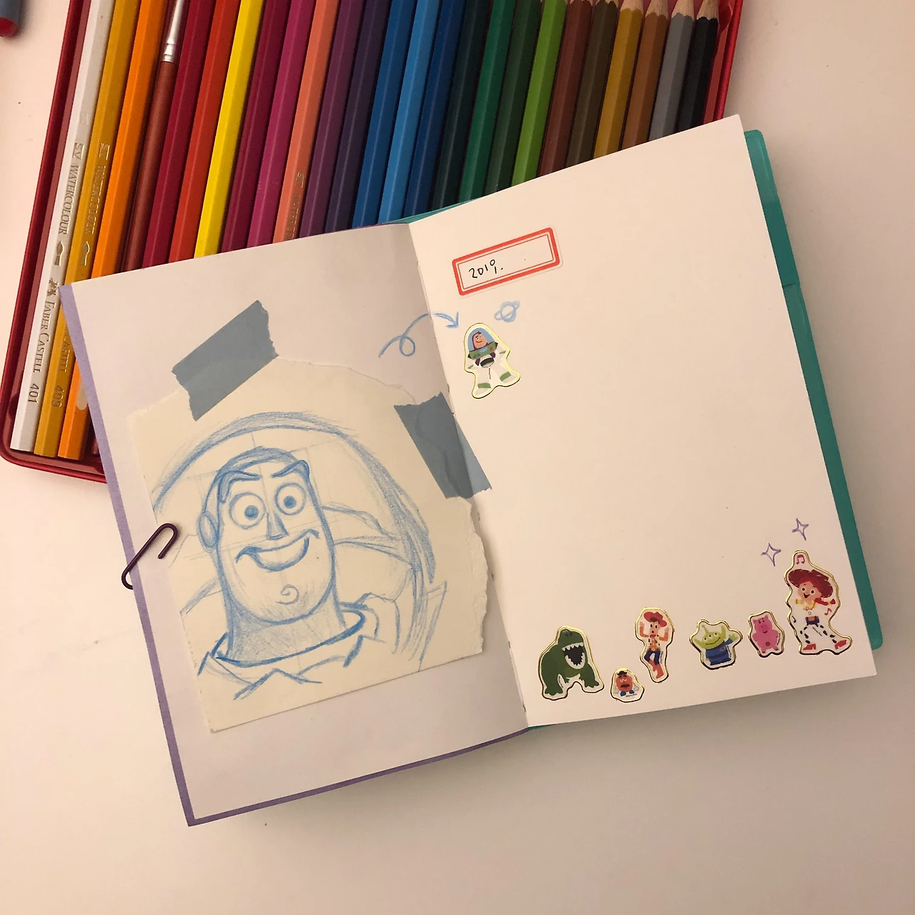 종이를 찢어 마스킹테이프로 일기장에 붙인 뒤 토이스토리 스티커로 주변을 꾸몄다. 다양한 캐릭터를 그리면 더 근사한 다꾸 재료가 되지 않을까.