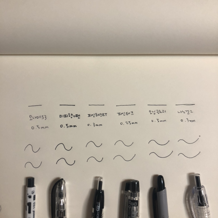 생각보다 여러 종류의 국산 제품을 찾기가 쉽지 않았어요. 볼펜 매대의 3분의 2 정도를 일본 제품이 차지하고 있었으니까요. 하는 수 없이 핫트랙스와 아트박스 두 군데를 들렀어요. 제가 산 펜은 아래 여섯 개입니다.