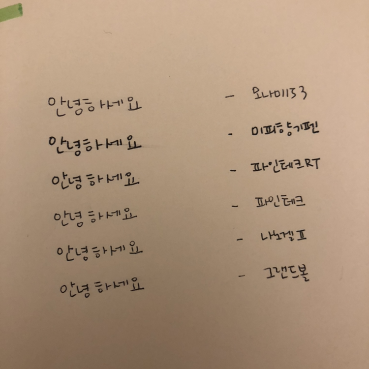 그간 하이테크, 시그노 등 일본 볼펜을 즐겨 썼던 저도 퇴근 후 문구점으로 발걸음 했어요. 이번 일을 계기로 국산 펜을 써보기로 했거든요. 여러 국산 볼펜 가운데 선 두께 0.5mm 이하인 제품 위주로 구입해 비교해봤습니다.