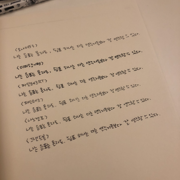 마지막으로 끊김 없이 매끈하게 써지는 펜을 알아보기로 했어요. 이성복의 시론 '무한화서'에 나온 구절을 적으며 확인했어요.