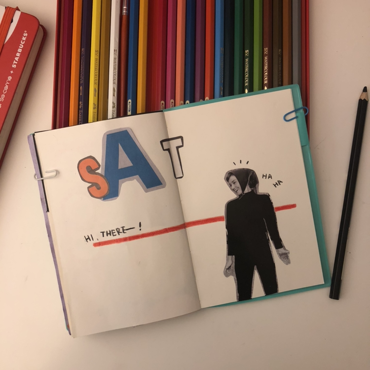 아래는 내가 패션잡지에서 미국 유명 배우 오드리 헵번의 사진을 오린 뒤 색연필로 포인트를 준 모습이다. SAT란 글자는 신문에서 잘랐다 :) 사진이 흑백일 경우 화려한 색의 색연필이나 펜으로 주변을 칠하면 확실히 느낌이 달라진다.