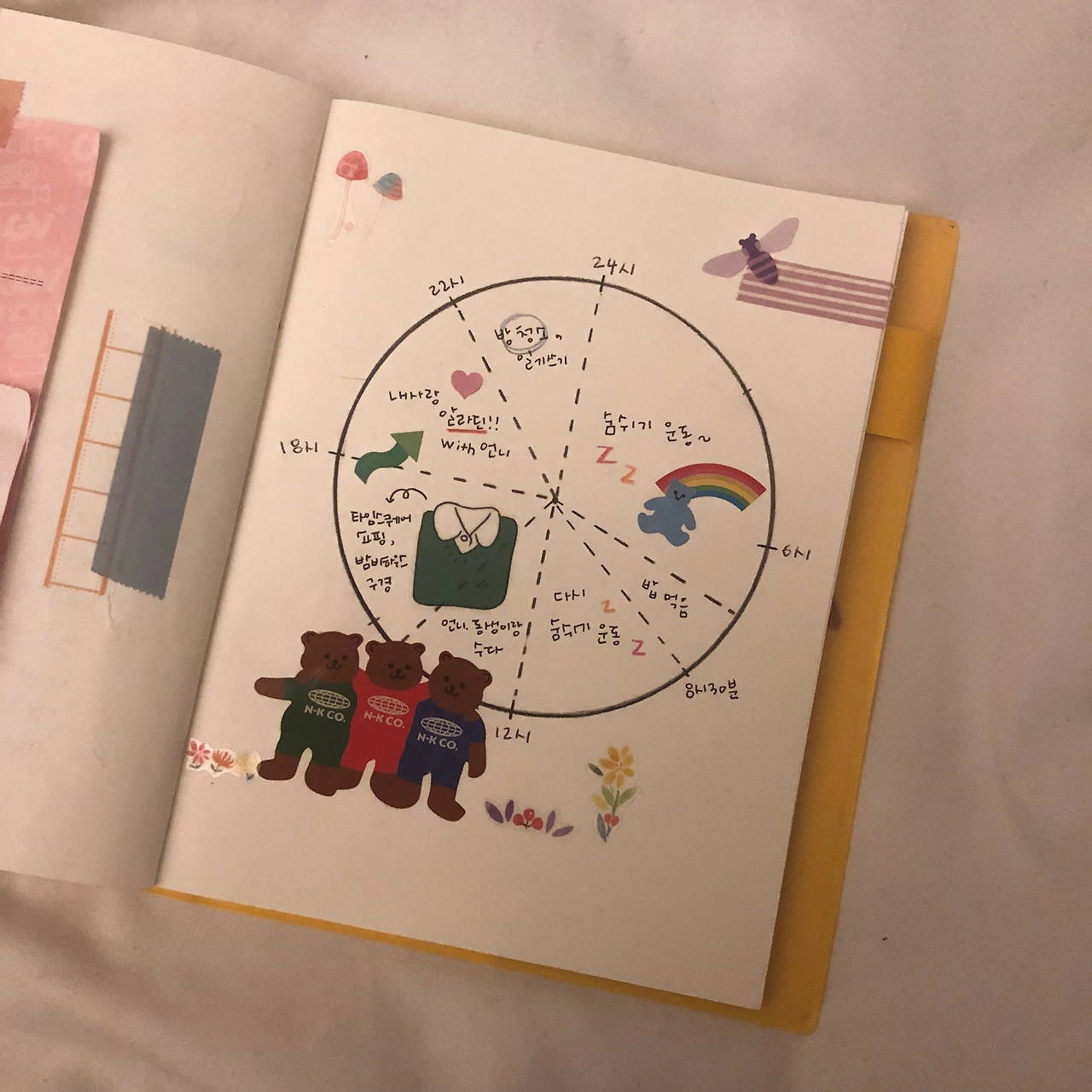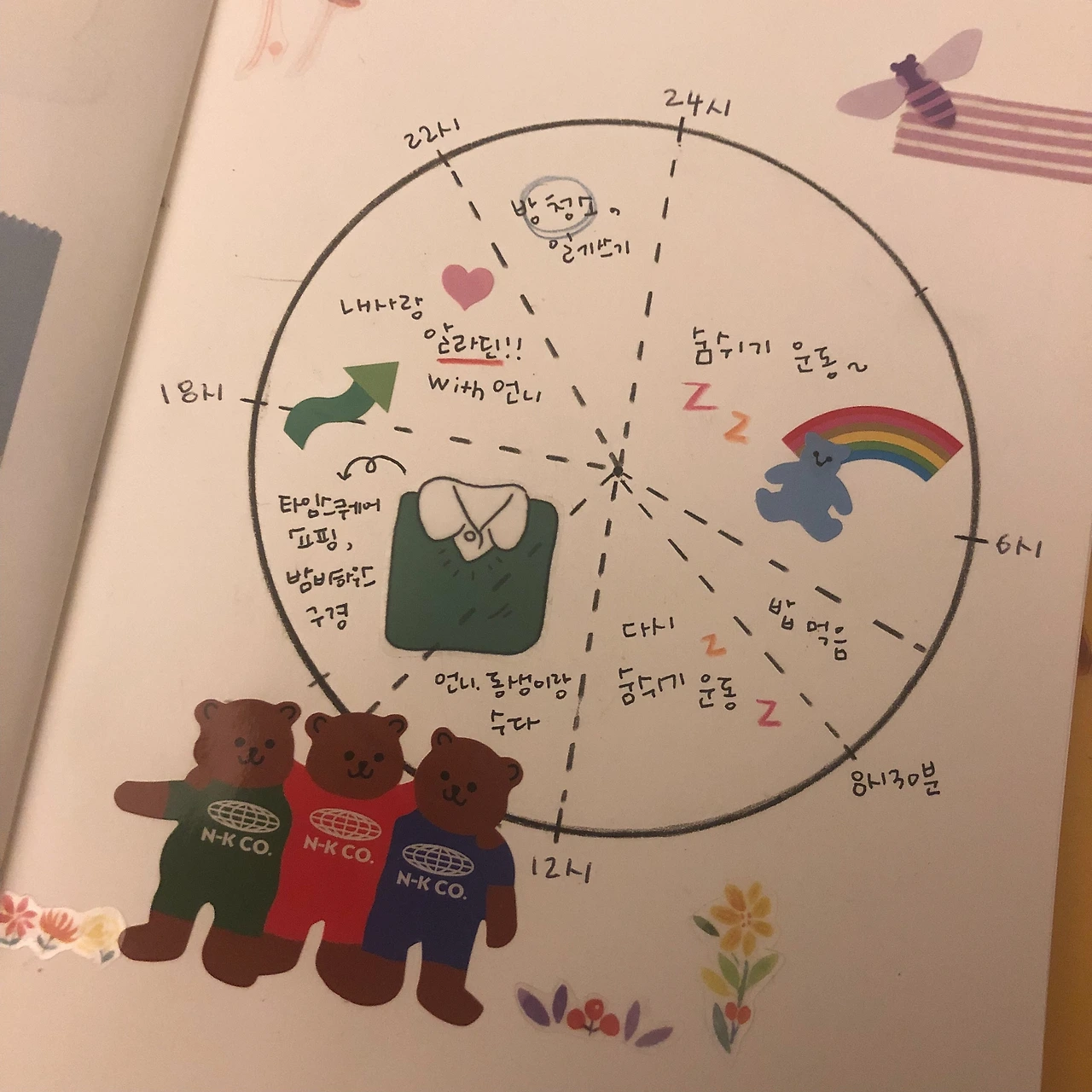 원을 그린 뒤 그 안에 나의 하루가 어떻게 흘러갔는지 그림을 그리거나 스티커를 붙여 표현하는 방법이다. 초등학생 시절 방학을 앞두고 만들었던 계획표와 모양은 동일하다. 미래의 일정이 아닌 이미 일어난 일을 담는다는 게 다를 뿐이다.