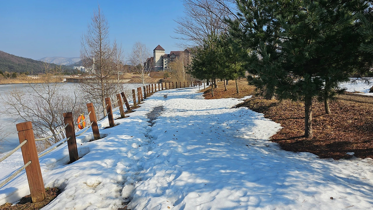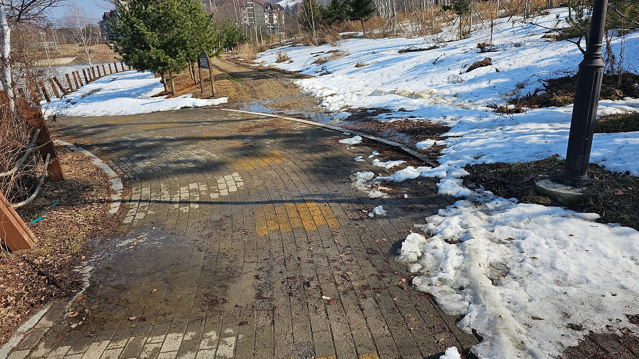 어느 지점에 있느냐에 따라 걷기도 힘들고 미끄러질까 봐 조심을 해야 한다. 눈이 녹아내리는 지점에는 신발이 젖을까 봐 조심스럽게 걸어야 한다. 또 바짝 마른 길에서는 마음 놓고 걸을 수가 있다.