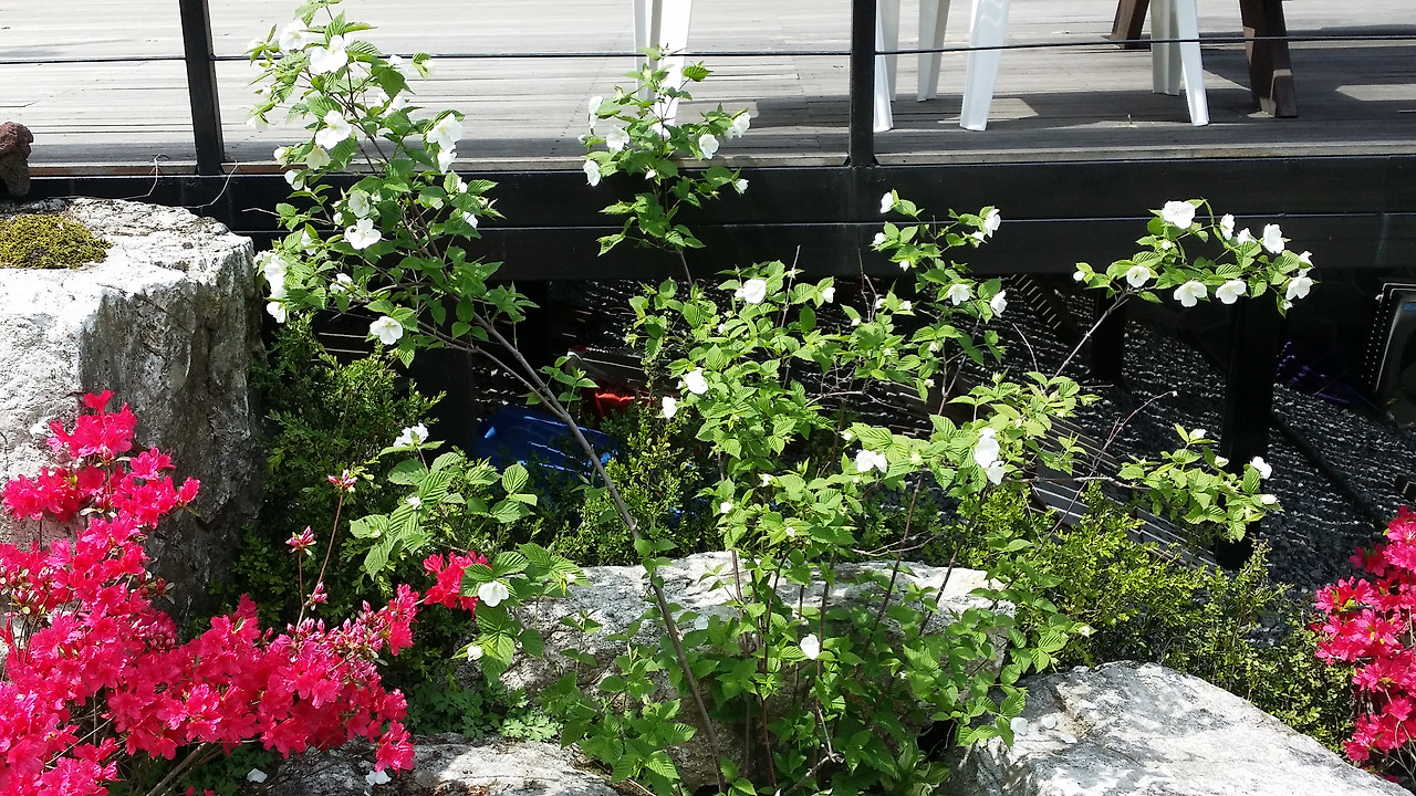 작년 하선재를 마무리 할 때에 아내를 위해 게스트룸으로 가는 복도에 커다란통창을 내고 그앞에 작은 돌을 주워다가 심고 세워서 꽃밭을 만들고 아내가 좋아하는 여러가지 야생화를 심었습니다.