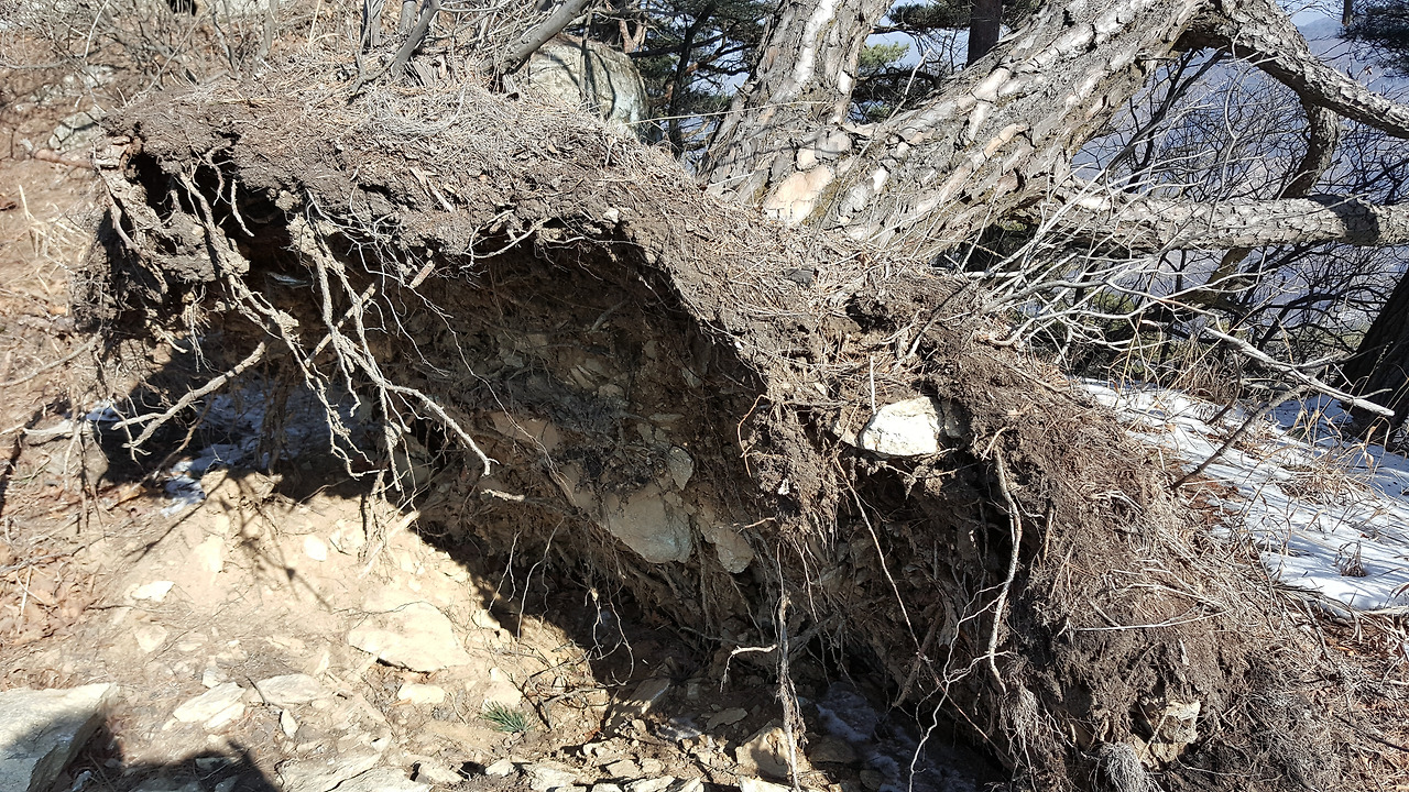 오히려 풍성하게 잎사귀를 지닌 소나무나 낙엽송이 뿌리째 뽑히는 경우는 있다.