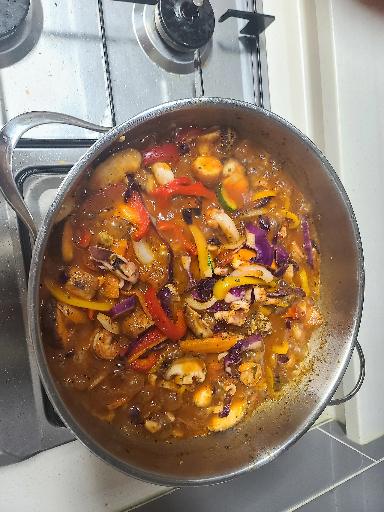 냄비에 올리브기름을 붓고 충분한 가열을 시킨 후 마늘과 파를 볶아서 기름 맛을 낸 후에 해물을 넣고 통후추와 함께 볶으면서 소금으로 간을 하고 썰어놓은 야채와 집사람 친구가 준 고추장을 서너 숟가락 넣고 물을 조금 넣고 볶는다.