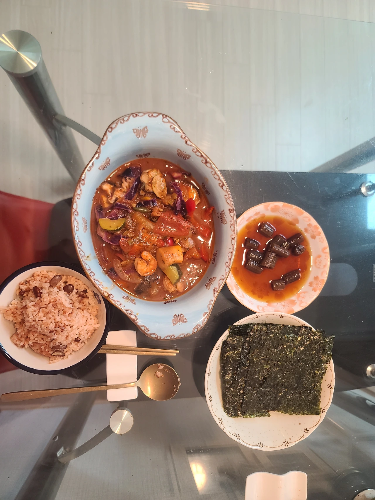 바질, 파슬리 등의 향신료를 넣고 약간 졸인 듯이 짜글 짜글 하게 끓여주면 지중해식 고추장 해물 야채볶음이 된다.
