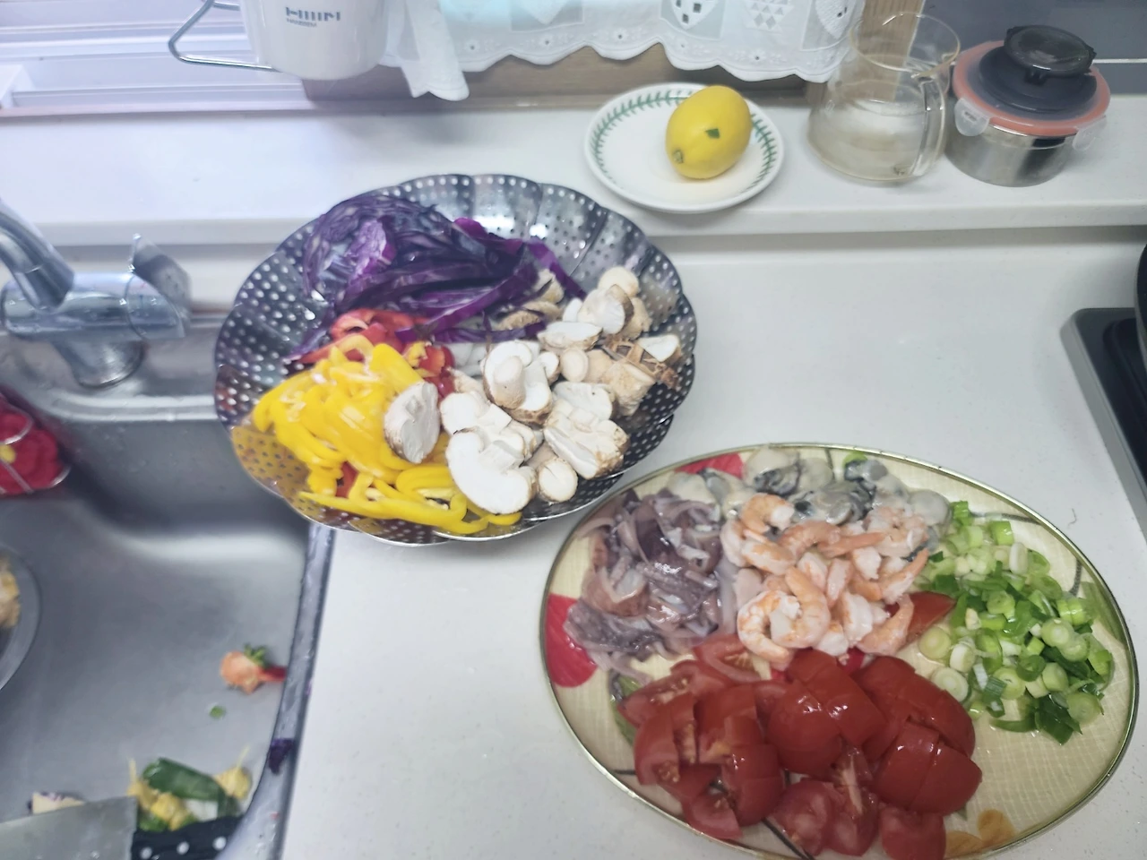 아내가 사놓은 오징어, 굴. 새우등이 냉동고에 얼려져 있었다. 파프리카, 양파, 마늘, 양배추, 토마토. 레몬, 당근, 호박. 버섯, 파 등을 야채칸에서 꺼내서 해물야채 고추장 볶음을 하기로 했다.