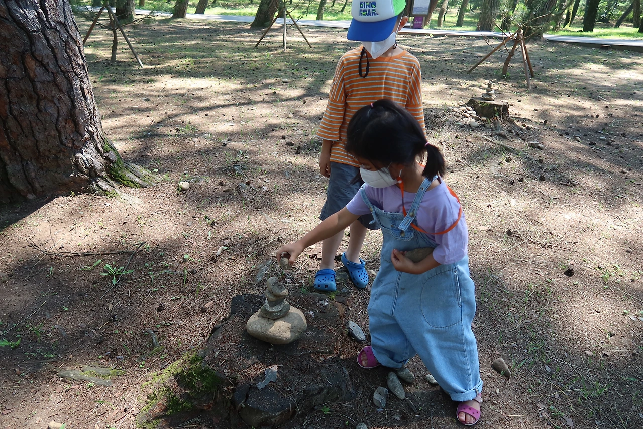 배에 내려 5분 정도 걸어가니 울창한 소나무 숲이 보였다. 2004년도에는 '아름다운 숲' 전국대회에서 우수상을 수상한 이력이 있어 그런지 숲이 정말 예뻤다. 청령포 숲에 들어와 있으니 시원해서 좋았다. 걷다 보면 단종이 머물던 곳 초가집, 한옥이 있는데 아이들은 관심이 1도 없었고 예쁜 돌 찾기도 하고 바닥에 있는 돌로 탑을 쌓고 놀았다는.....