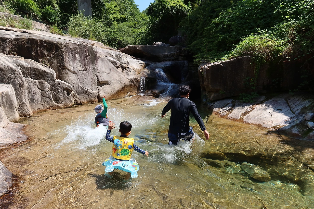 능강 계곡에 도착해서 주차장에 주차하고 바로 계곡으로 갔다. 노지 캠핑하시는 분도 계셨고 평일인데도 계곡에 사람들이 꽤 있었다. 능강 계곡은 SNS에서 보던 대로 물도 맑고 아이들이 놀기도 좋았다. 이 날 폭염으로 정말 무더웠는데 계곡 물이 차가우니 정말 시원했다. 아이들은 계곡 물에서 덜덜 떨 정도 ㅎ ㅎ 여름엔 무조건 계곡이다. 계곡에서 놀다 처음으로 개구리도 만났다. 4살 3호는 개구리를 보고 당황하지도 않고 손으로 만지고 놀았다는..