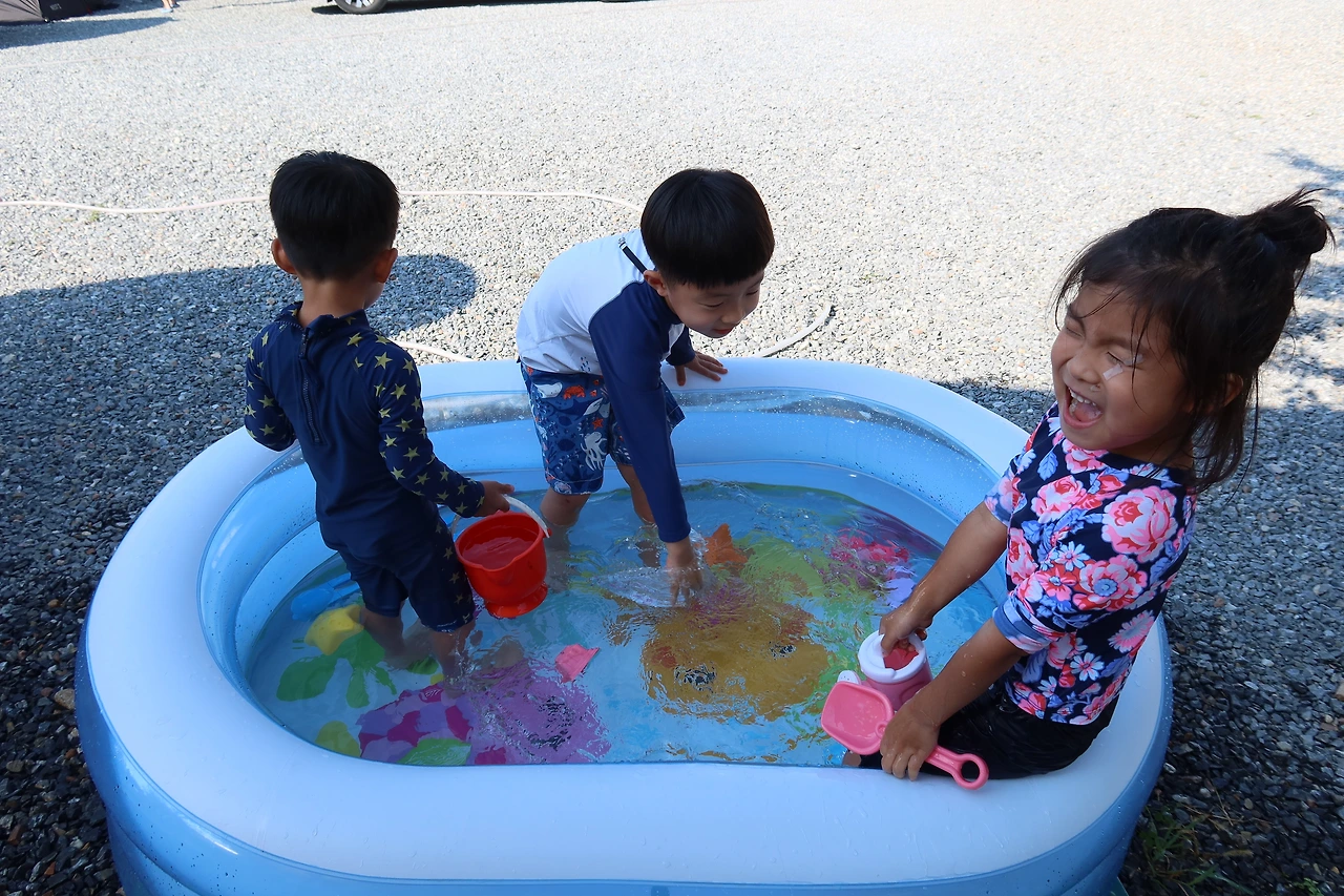 한 시간을 더 달려 영월 캠핑장에 도착했다. 아이들이 사이트 한편에서 놀고 있을 때 남편과 나는 빠르게 텐트 세팅을 끝냈다. 한 여름엔 영월 산 골이 이리 더울 줄 몰랐다. 뷰 존을 예약했다 타프 존으로 바꾸길 잘 했다. 한 여름 캠핑은 더위와의 전쟁이다. 영월 캠핑장에서 더위를 피하는 방법 작은 풀장에서 물 받아 놀고 도쿄 올림픽 경기 보며 응원하기! 이 날 금메달까지 따서 더위가 싹~ 가셨다는 ㅎ