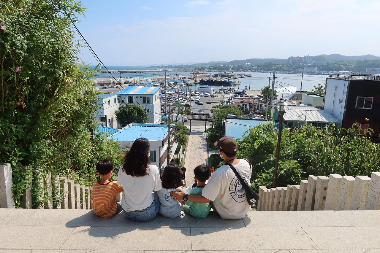 드라마 속 장면을 보기 위해 계단을 올라가야 했는데 날은 무지하게 덥지 아이들은 빨리 아이스크림 사달라고 졸라대지 내심 계단을 올라가고 싶지 않기도 했다. 그래도 여기까지 왔으니 한 번 올라가 보자 하고 올라갔는데 안 올라왔으면 인생 가족사진을 못 찍을 뻔했다. 위에서 내려다본 구룡포 풍경도 예쁘고 사진도 예쁘게 잘 나와서 갑자기 기분이 좋아졌다.