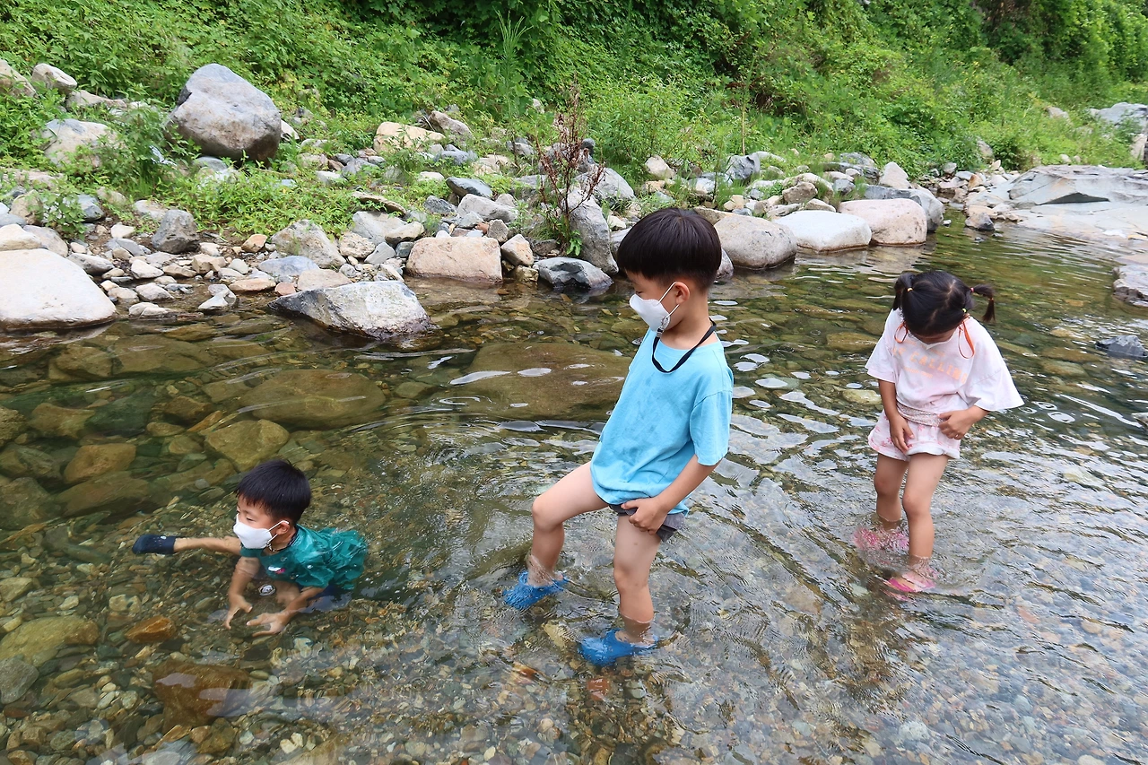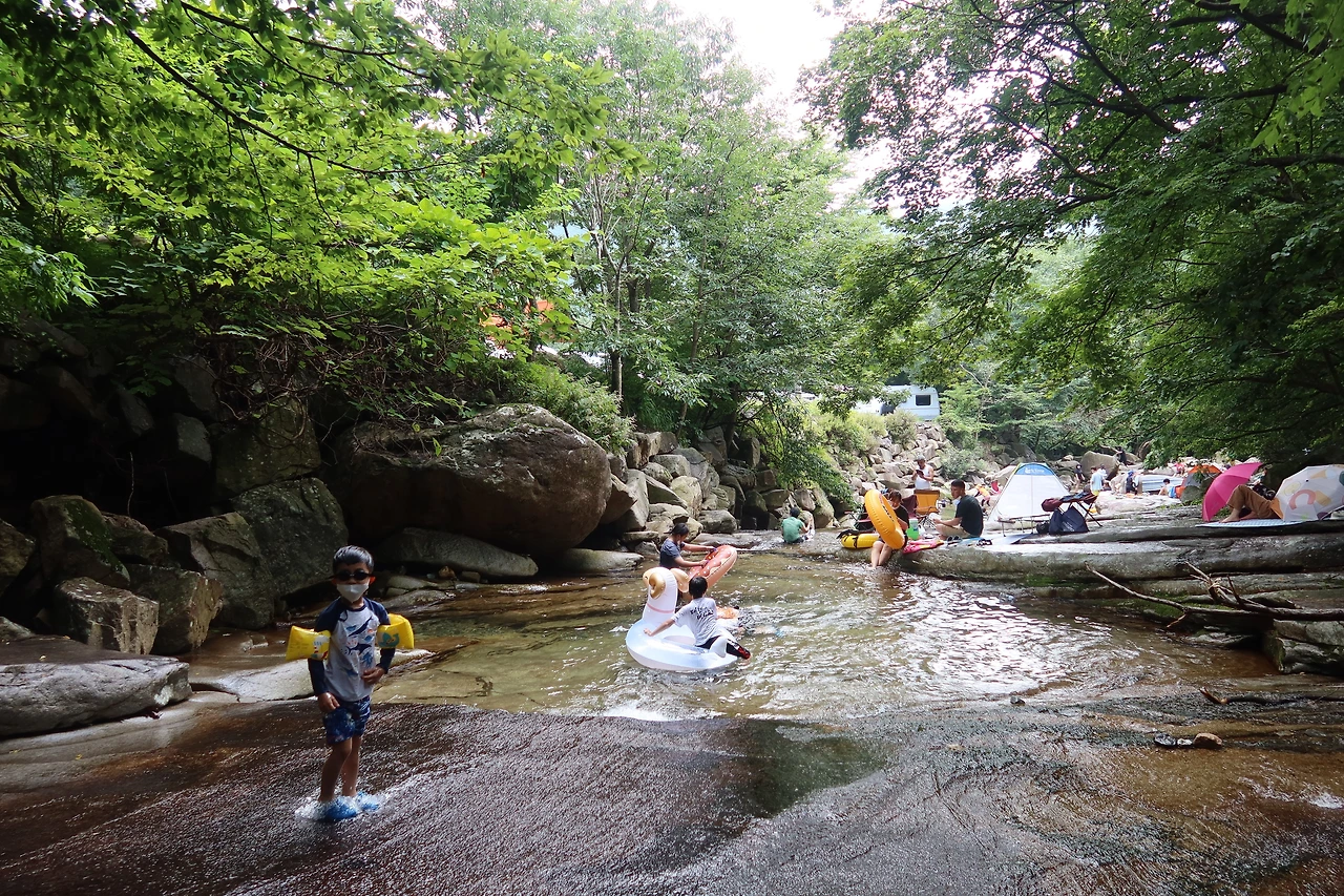부산집에서 기분 좋게 식사를 마치고 호박소 계곡으로 갔다. 주차장에 주차하고 계곡으로 내려가니 오~ 계곡 물이 맑고 좋아 보였다. 전국 여행 다니기 전 삼막사 계곡, 서울랜드 캠핑장 계곡에 갔을 땐 물이 많이 없었는데 밀양 호박소 계곡은 물도 많은 데다 얕은 물도 있고 깊은 물도 있고 아이들이 놀기 좋았다. 유명한 호박소 폭포까지 올라가 보진 못했지만 호박소 계곡에서 물놀이했던 것만으로 충분했다. 밀양 얼음골은 3월 초순경에 얼음이 얼기 시작하여 7월 중순까지 유지된다고 하니 계곡에서 놀 땐 계곡물이 차가워 한낮 더위도 잊힌다.
