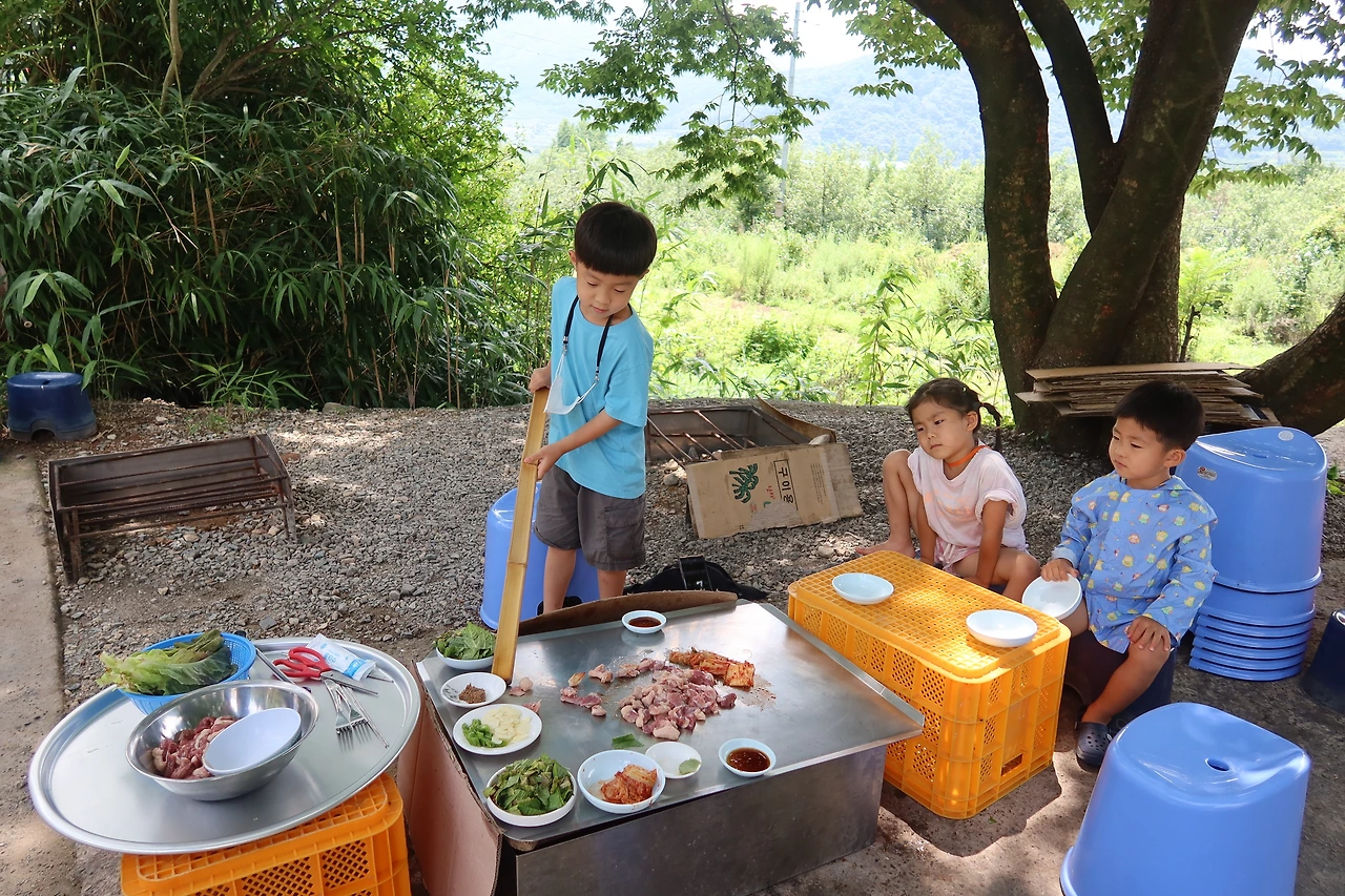 표충사에서 실컷 놀고 점심 먹으러 인골산장으로 갔다. 한적한 산골 마을에 위치한 인골 산장.. 올라가는 길이 조금 험하긴 하지만 사과밭 뷰며 야외 테이블이며 철판이며 딱 내 스타일이다. 그러고 보니 아이들하고 밀양에서 유명한 SNS 핫플은 다 다녀봤다. 사람들이 왜 많이 가는지 알겠다는! 테이블이며 의자며 아이들이 있기 불편하진 않을까 걱정했지만 웬걸 잘 있었고 오리고기가 맛있다며 잘 먹었다.